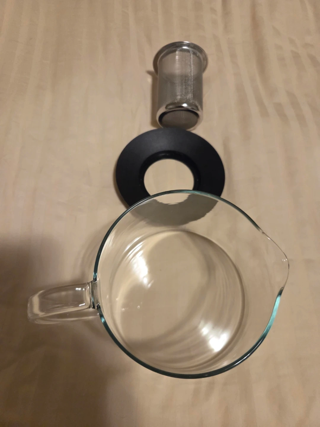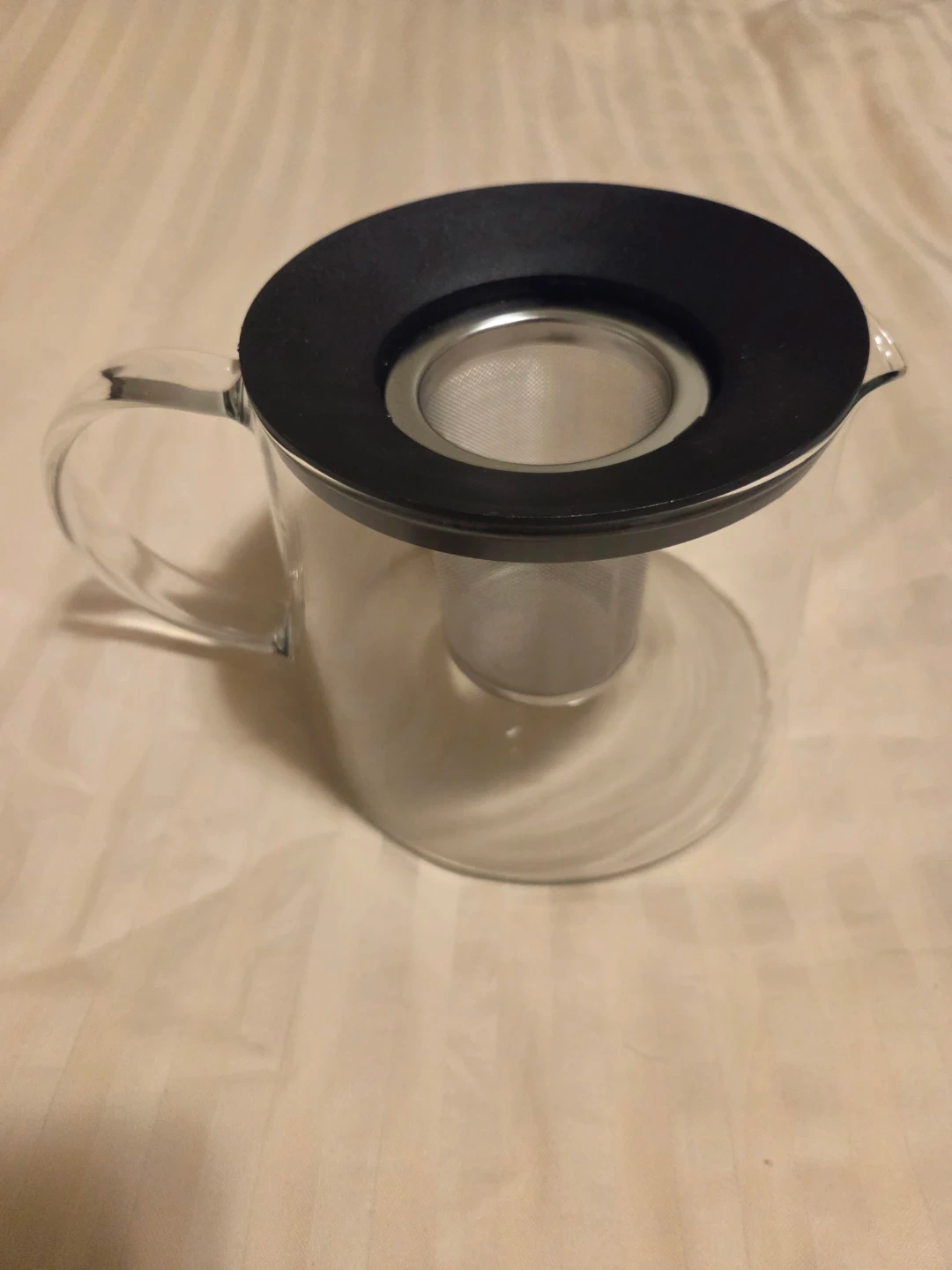 Clear glass teapot with a removable mesh infuser and black lid. It's suitable for brewing loose leaf tea. This teapot is easy to clean and has a simple, modern design.
