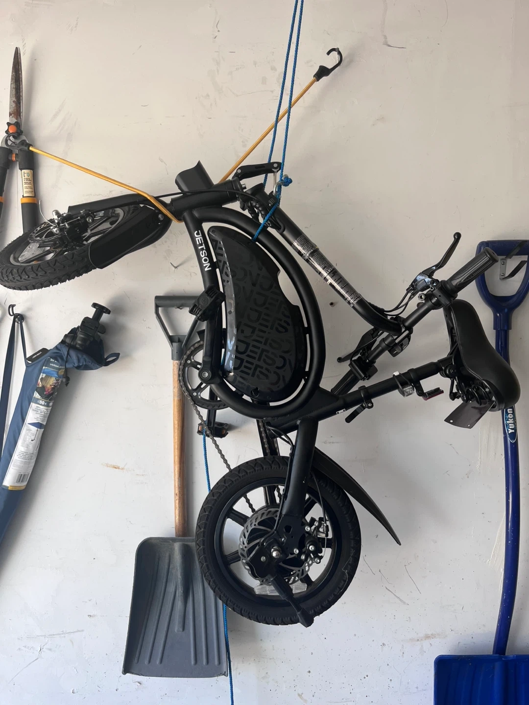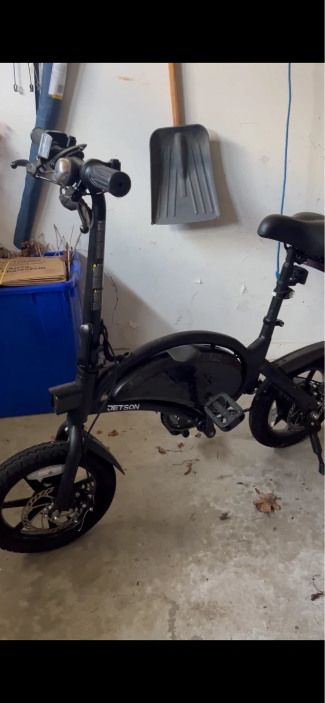 Jetson electric folding bike, black. Like new, rarely used. It features disc brakes and a foldable frame for easy storage. This bike is great for commuting or casual rides. Includes charger.