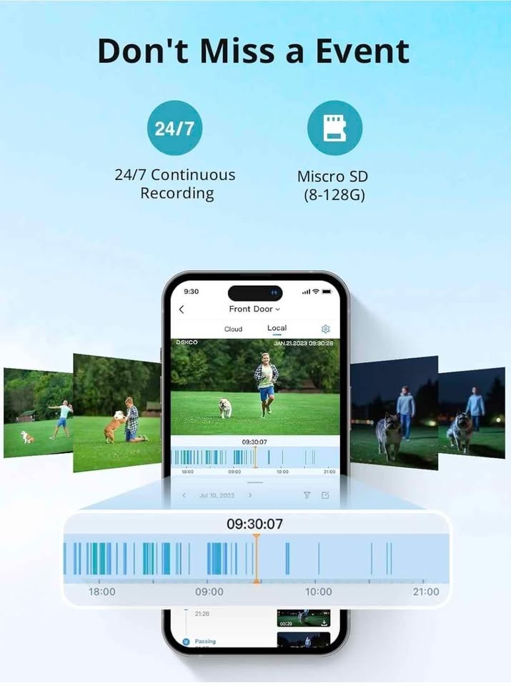 Flexible Storage Options: Offers local storage via SD card as well as cloud storage services, enabling 24/7 continuous video recording so you can revisit important moments at any time.
