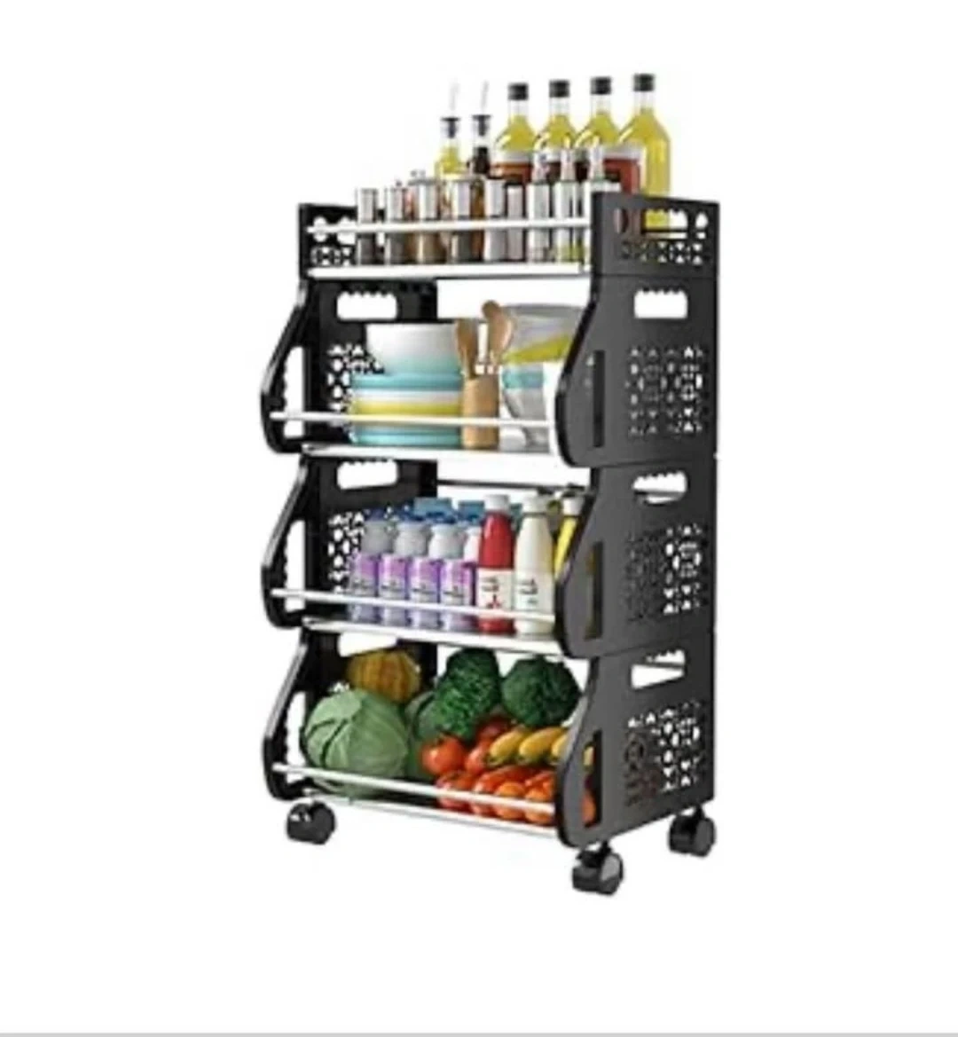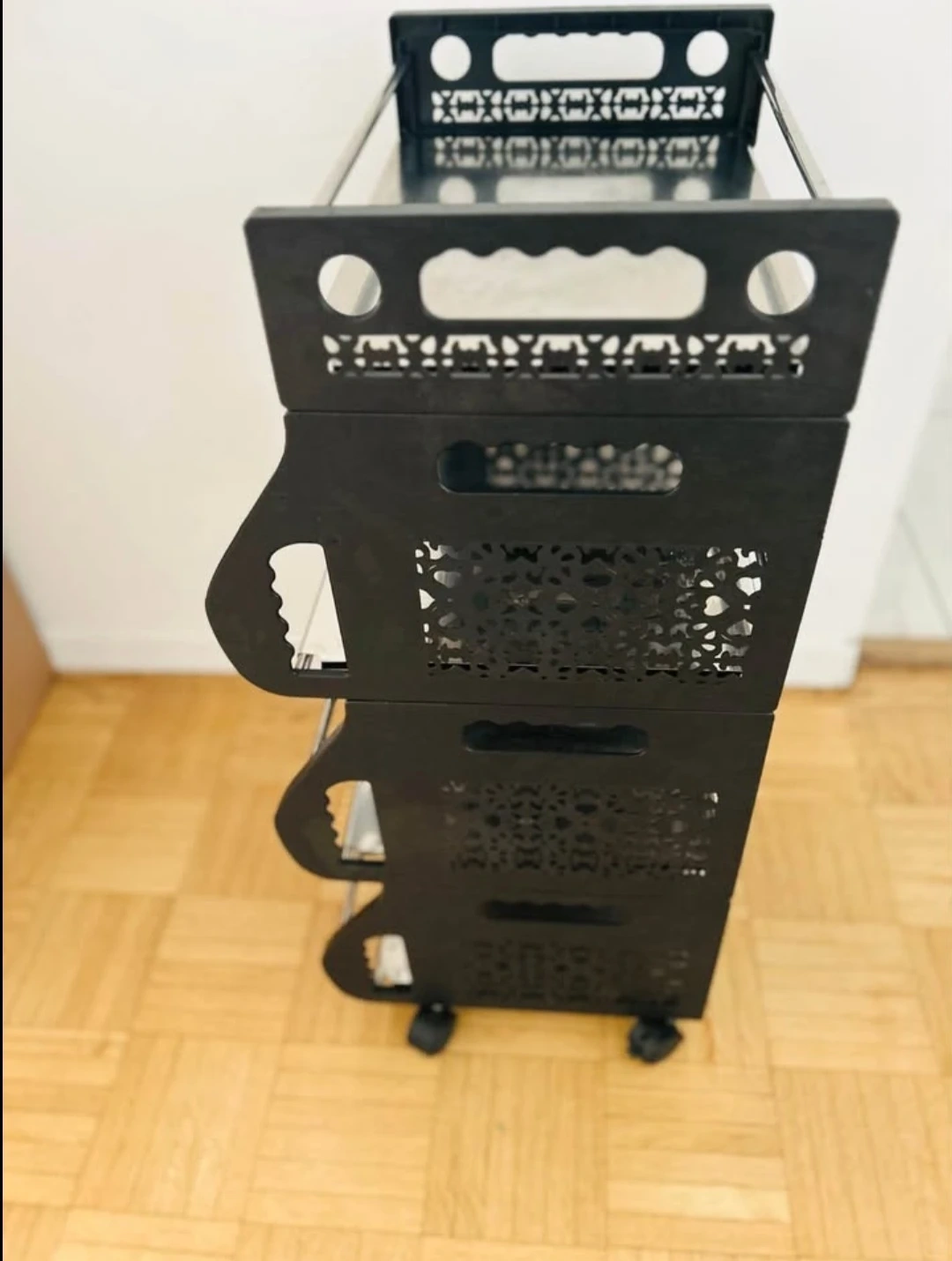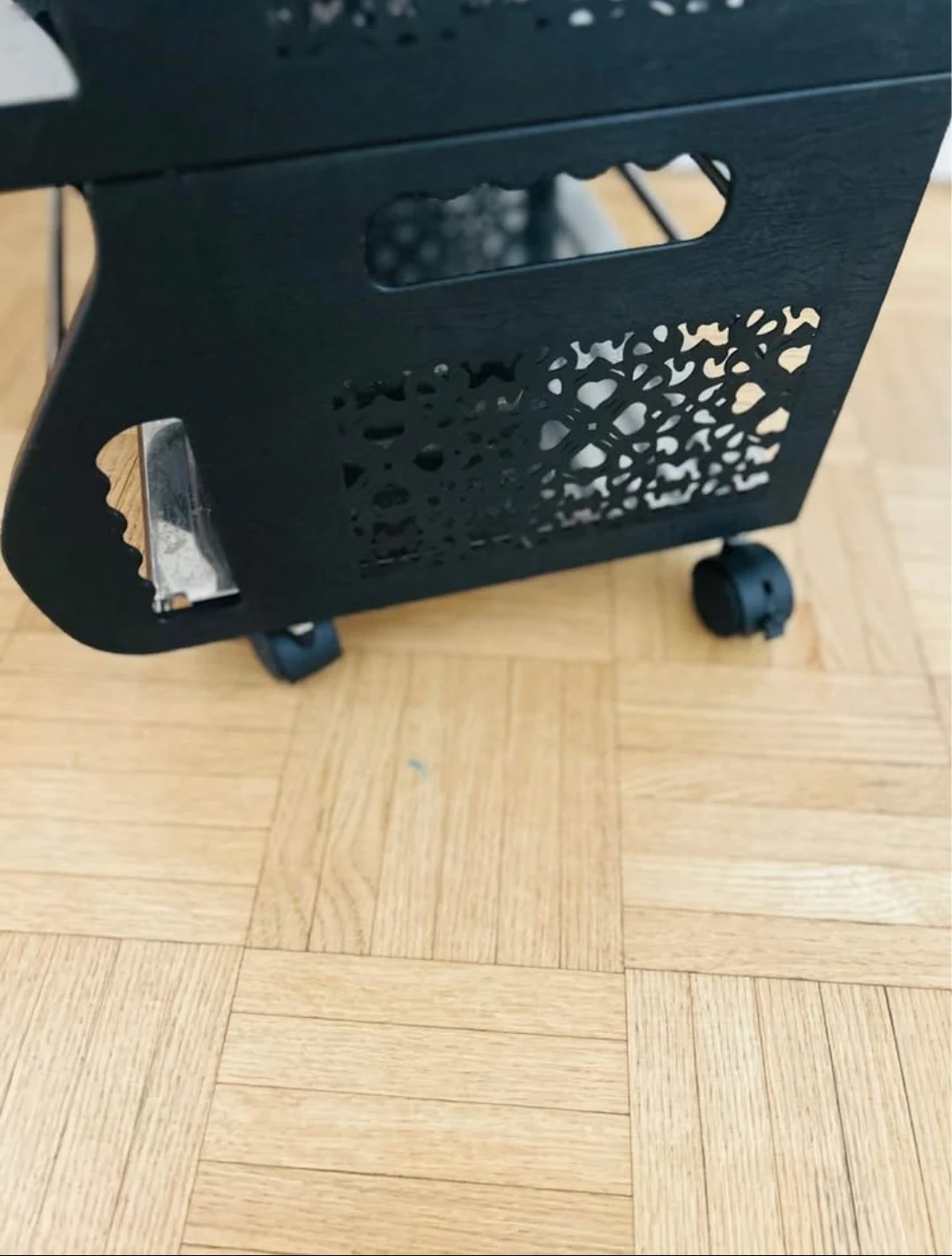 This is a 3-tier rolling storage cart. It has metal shelves and a black frame with decorative cutouts. The cart features wheels for easy movement. Pick up only. No refund.