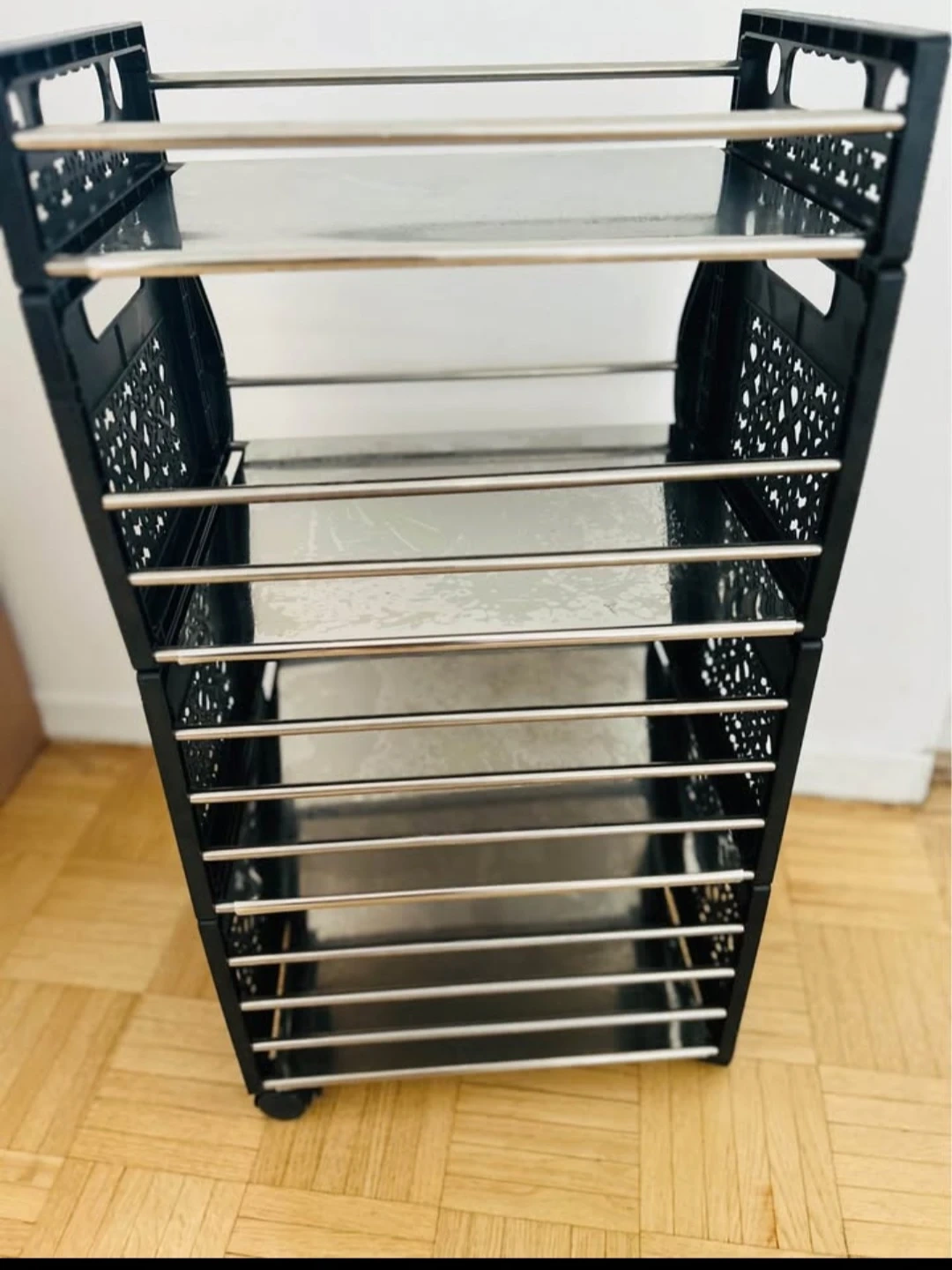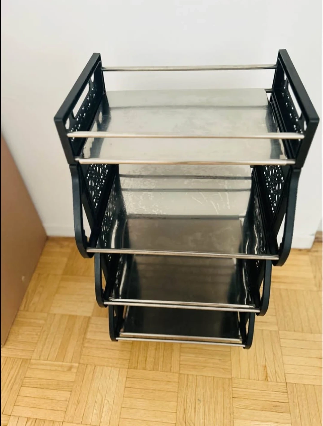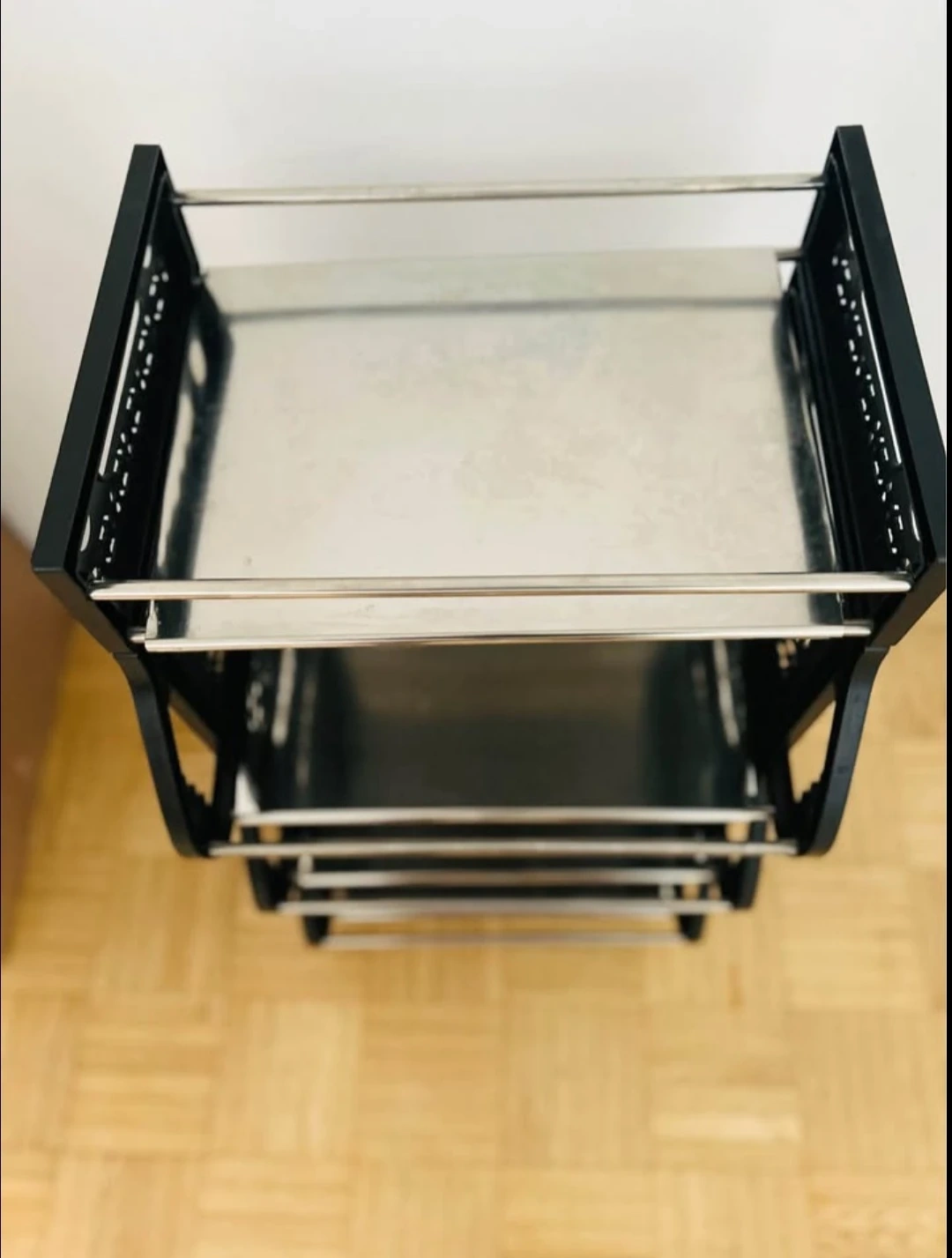 This is a 3-tier rolling storage cart. It has metal shelves and a black frame with decorative cutouts. The cart features wheels for easy movement. Pick up only. No refund.