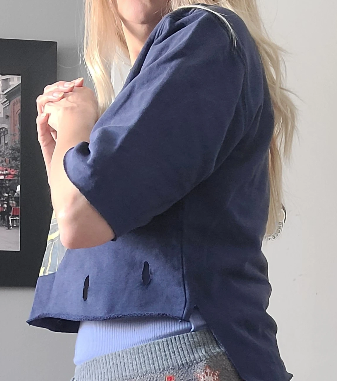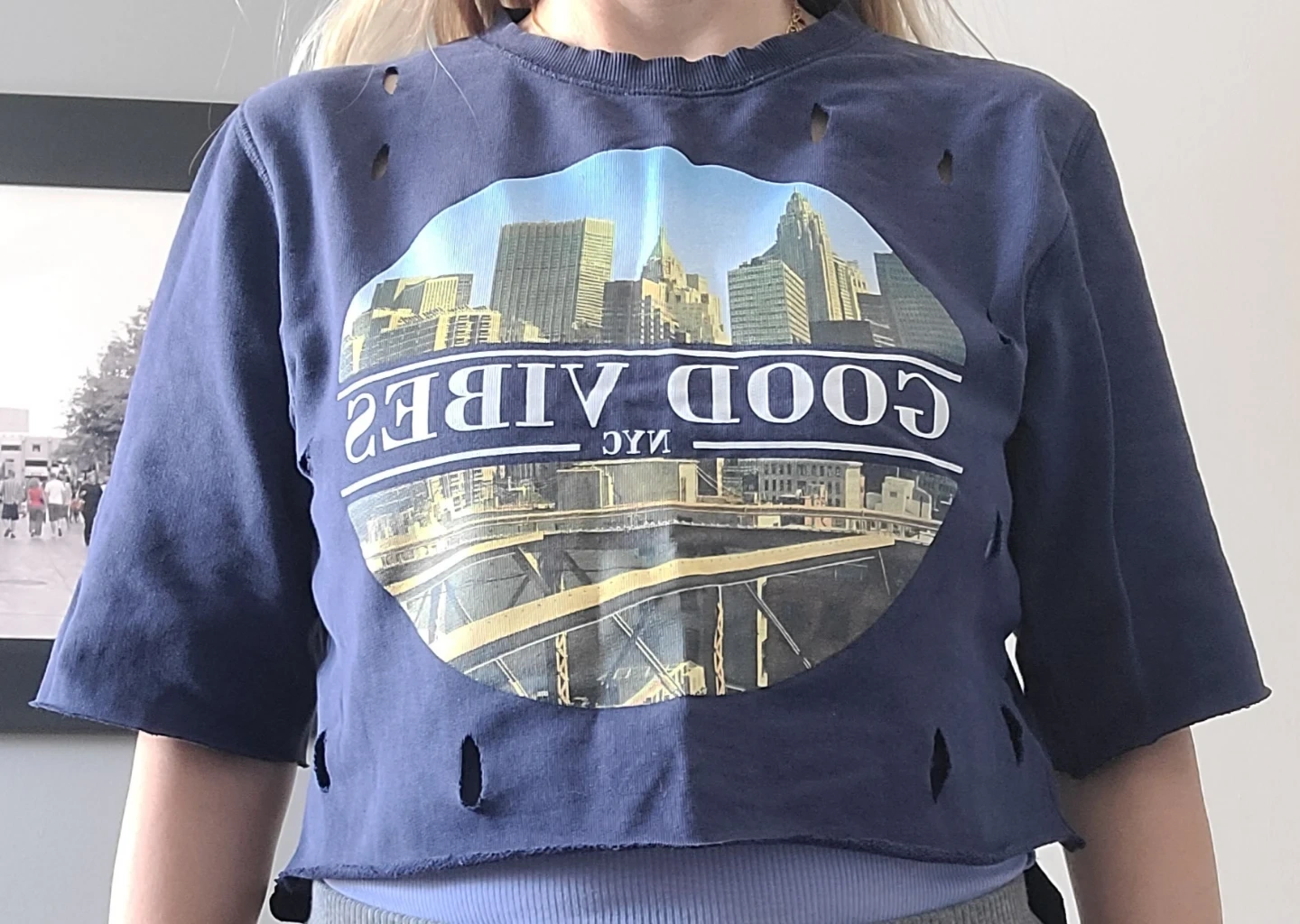 Navy blue cropped t-shirt featuring a "Good Vibes NYC" graphic. It has a distressed look with cut-outs. Short sleeves and a raw hem finish.