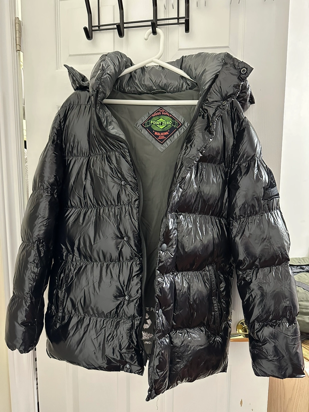 Black puffer jacket with a shiny finish. Features a hood and a zipper closure. Has a Point Zero logo patch on the chest and another on the sleeve. for sale for pick up first come first serve cash only