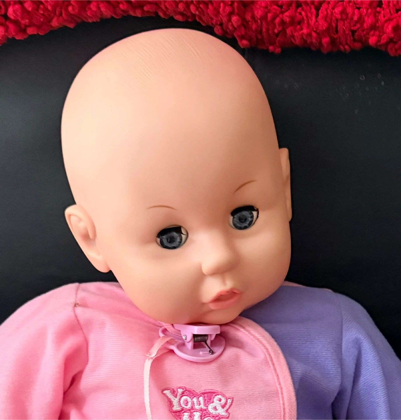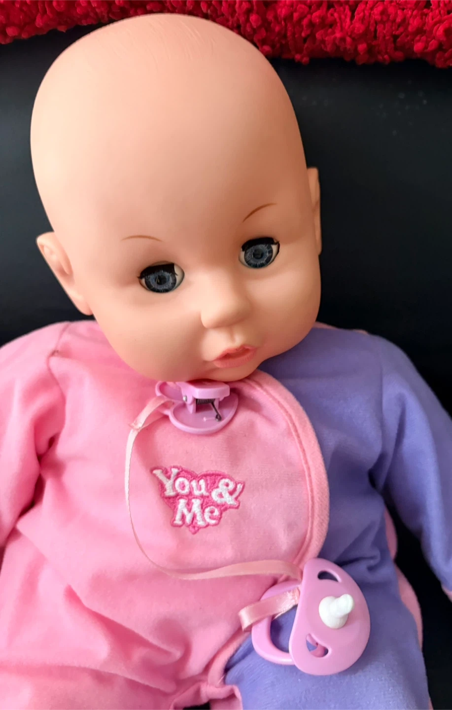 This adorable baby doll is from the brand You & Me. It's wearing a cute pink and purple outfit and comes with a pacifier. A sweet addition to any doll collection!
