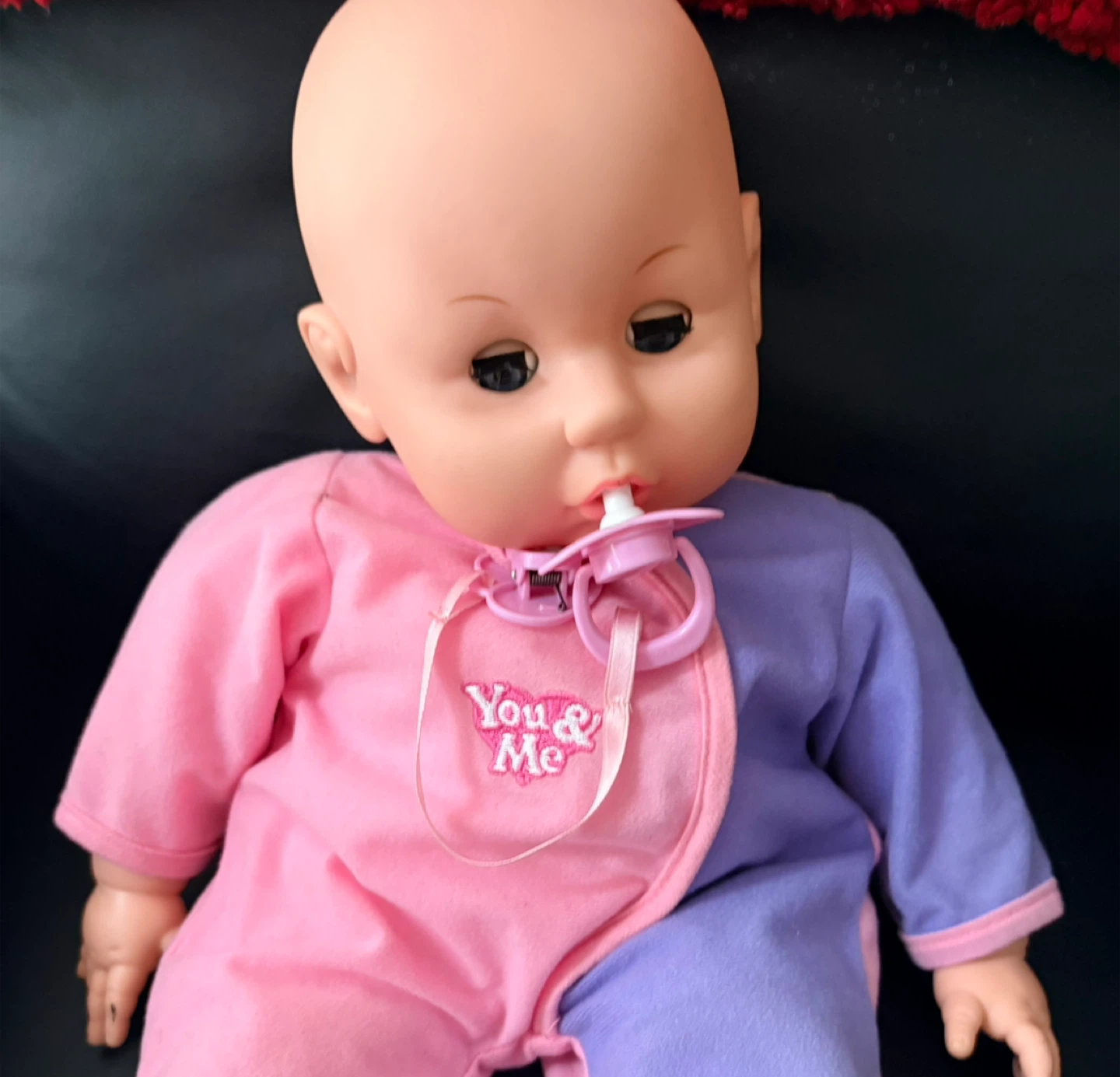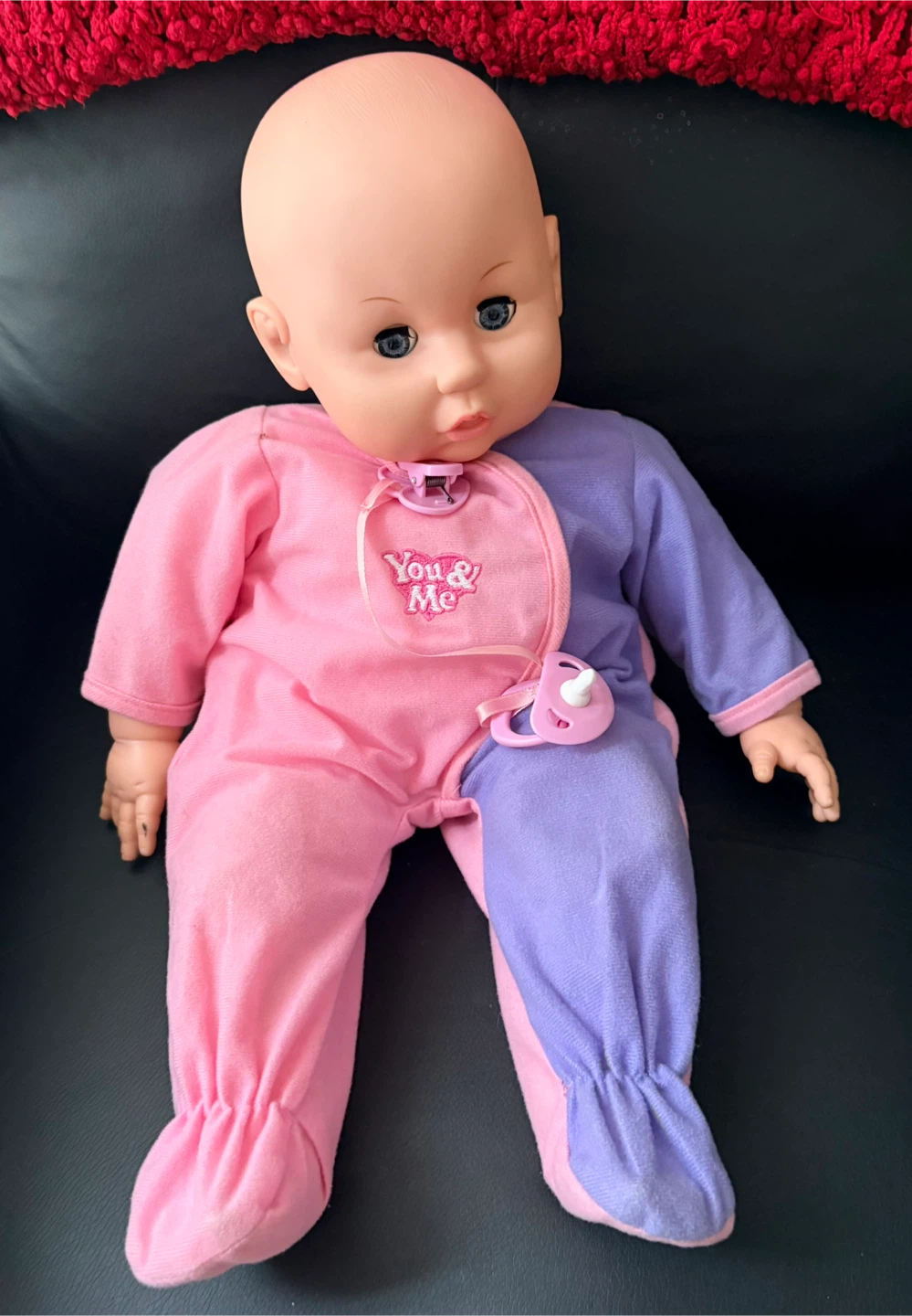 This adorable baby doll is from the brand You & Me. It's wearing a cute pink and purple outfit and comes with a pacifier. A sweet addition to any doll collection!