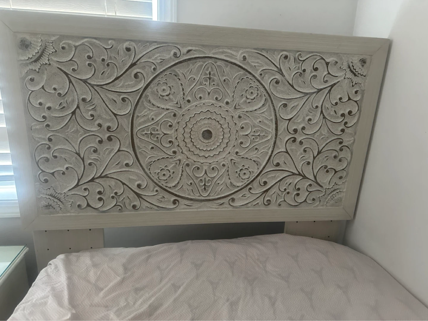 A decorative cream-coloured headboard with intricate carvings. It's designed to fit single sized bed frame. The detailed pattern adds a unique touch to a bedroom.