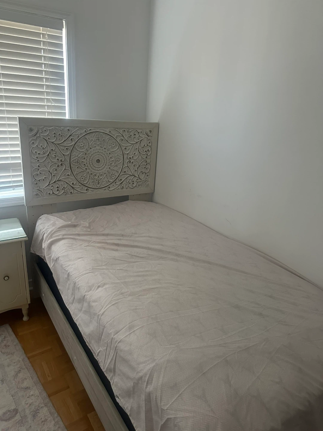 A decorative cream-coloured headboard with intricate carvings. It's designed to fit single sized bed frame. The detailed pattern adds a unique touch to a bedroom.