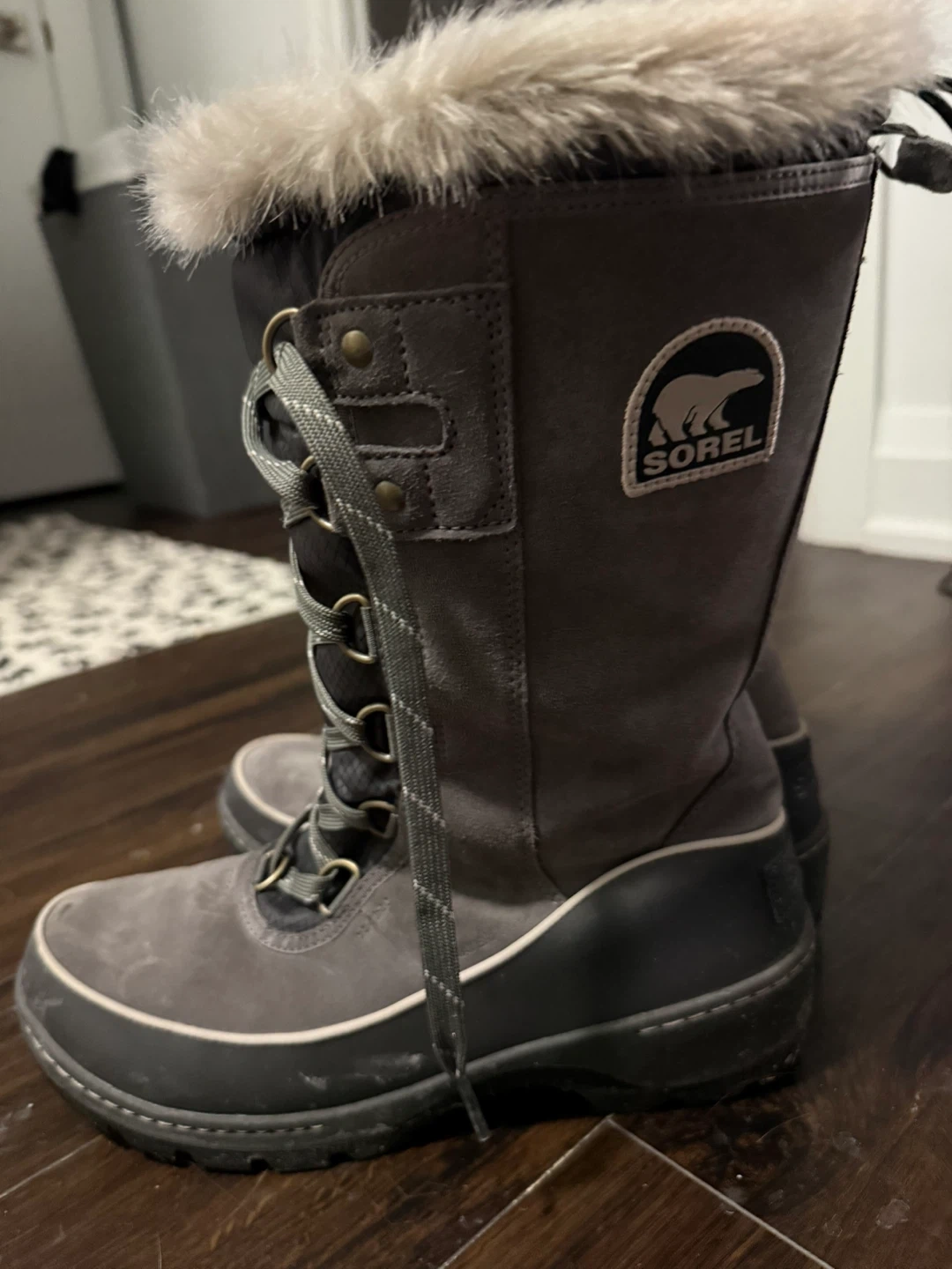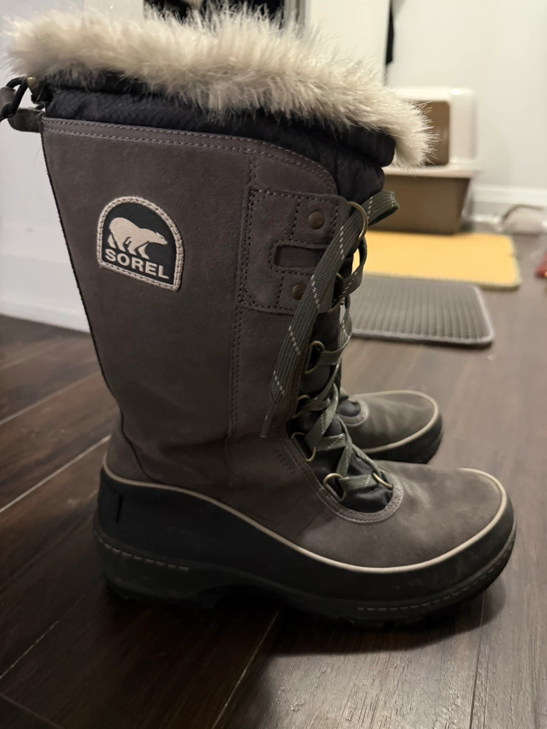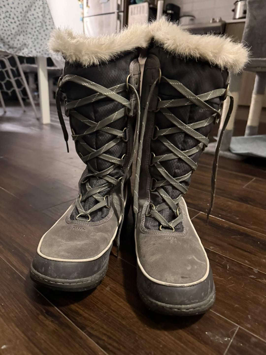 Sorel women's tall winter boots in grey suede and black rubber. These boots feature a faux fur trim and lace-up front. They're insulated for cold weather. Size 10.5 USA.