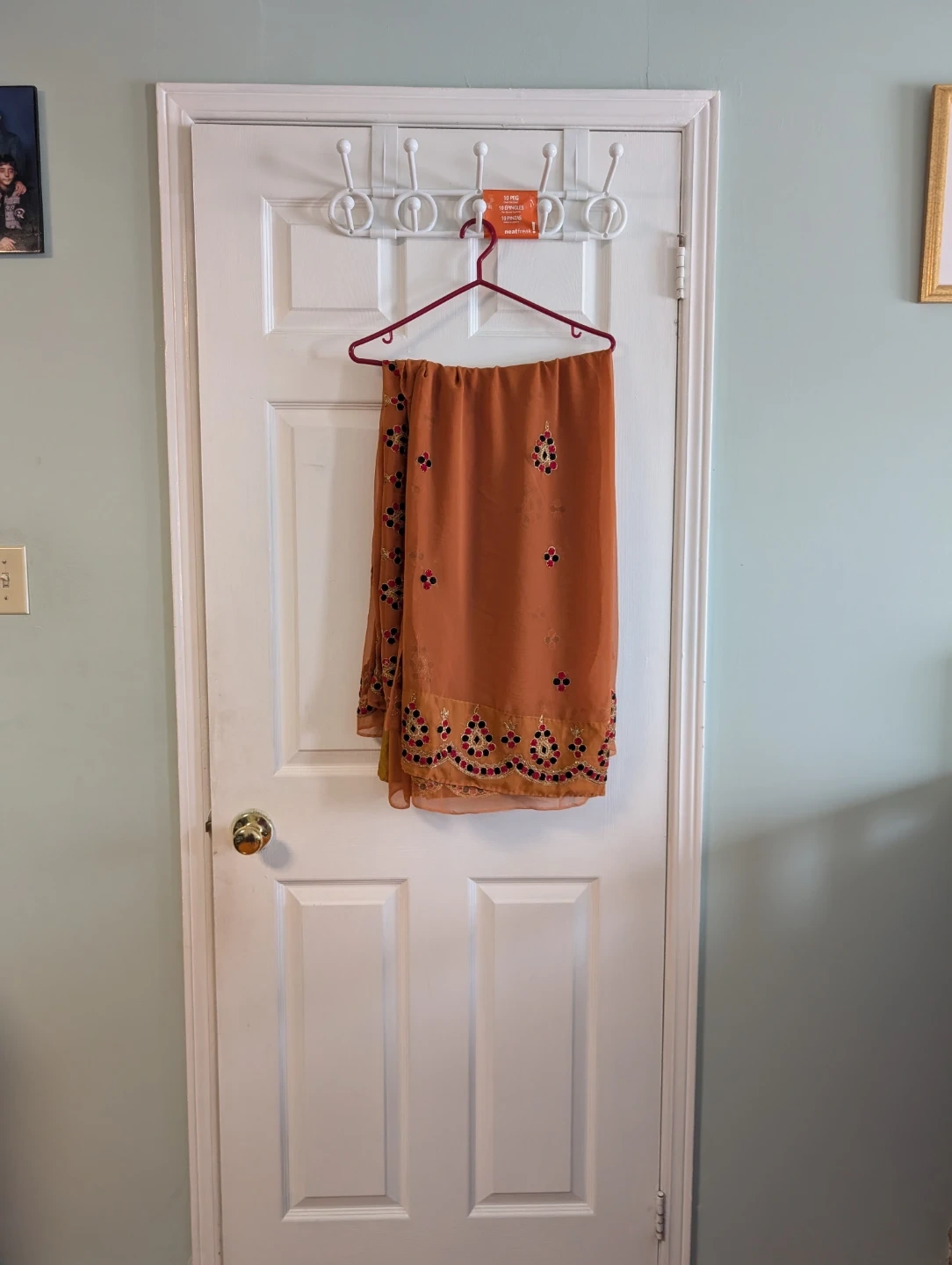 This lot includes four beautiful sarees in various colours: orange, green, red, and pink. They're adorned with intricate embroidery and designs. Great for special occasions!