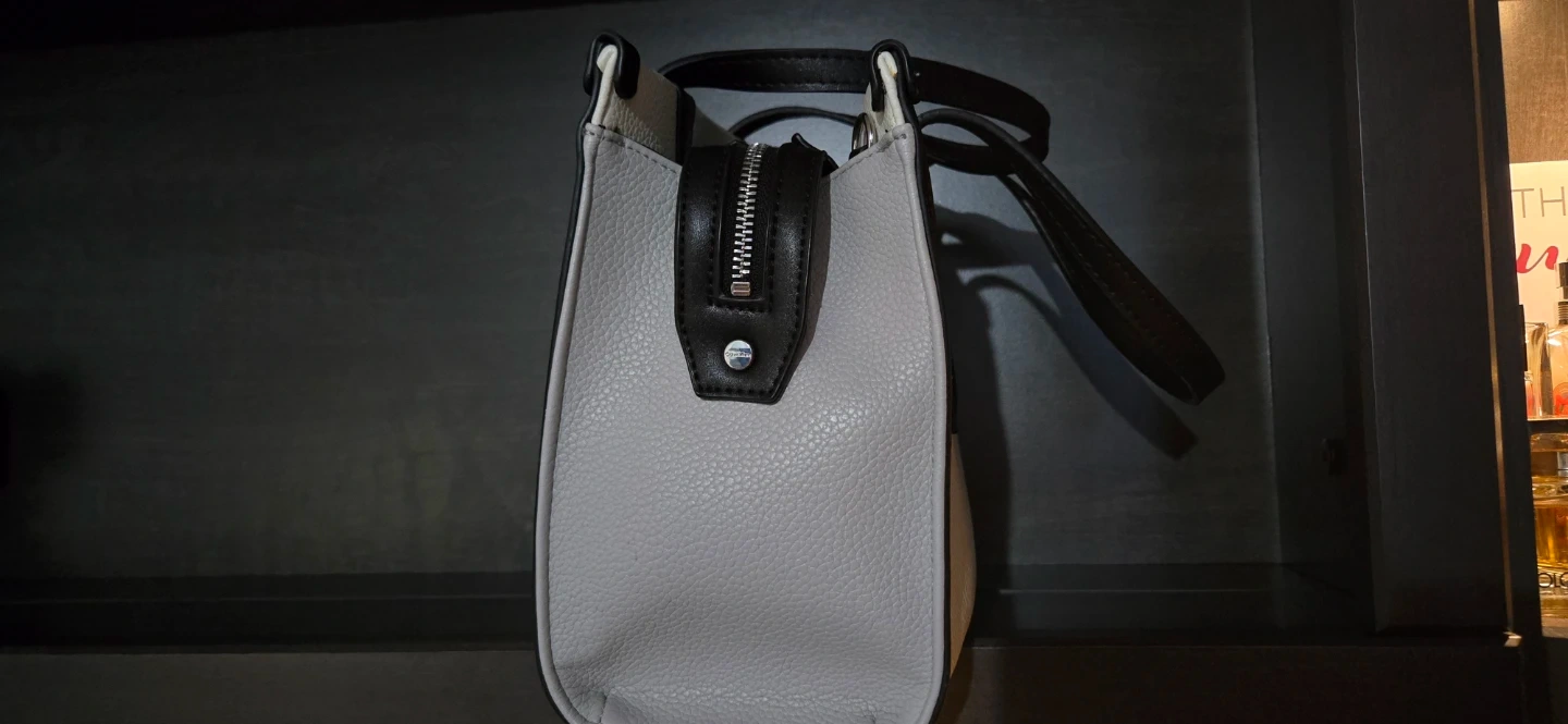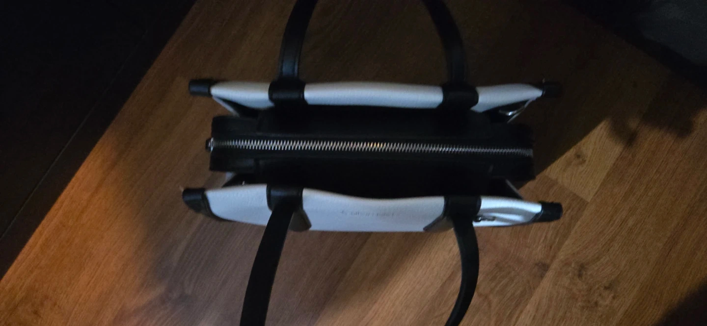 This Calvin Klein purse is white with black trim and handles. It features a zippered main compartment and a structured design. It's a stylish accessory for everyday use.