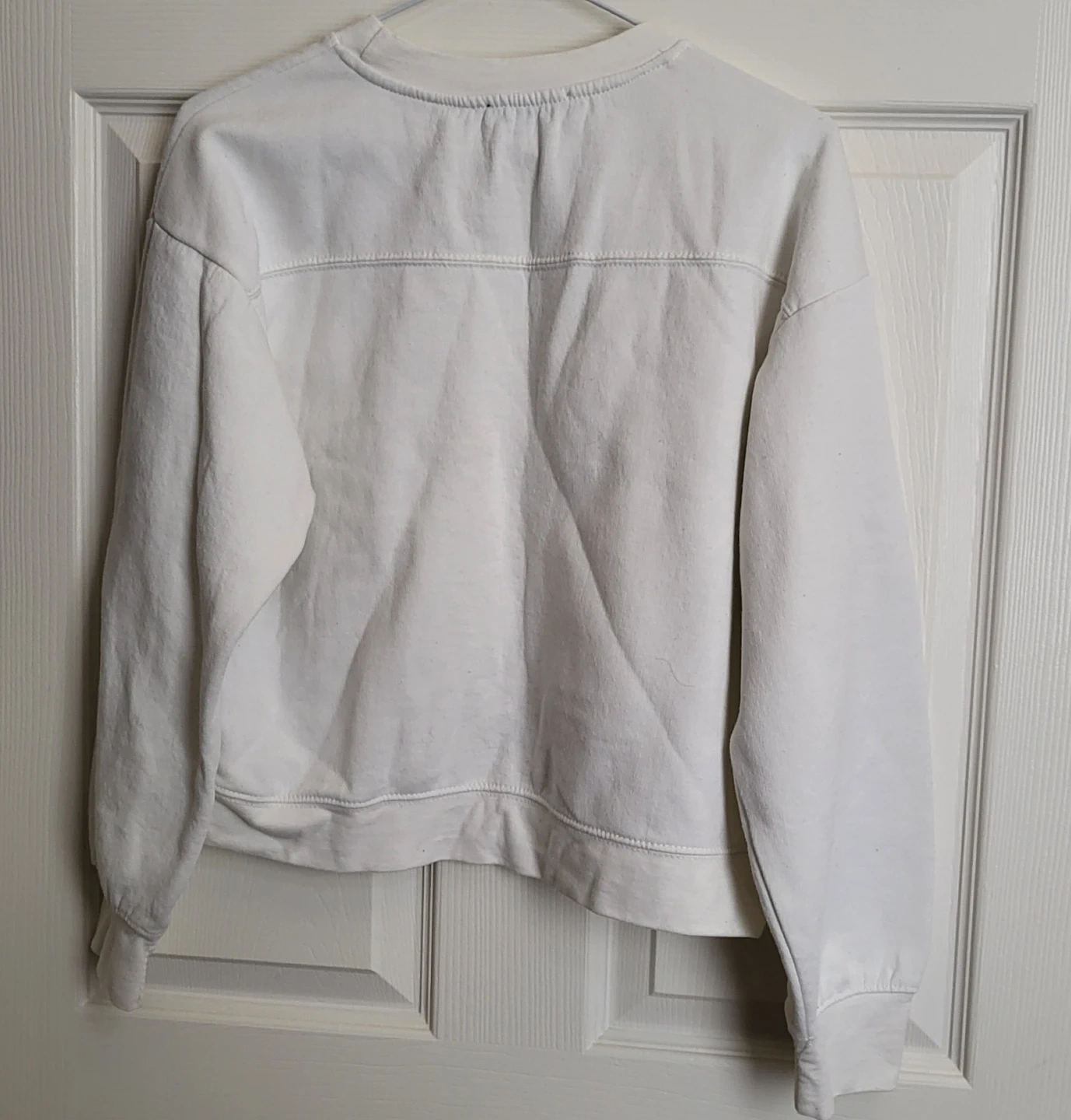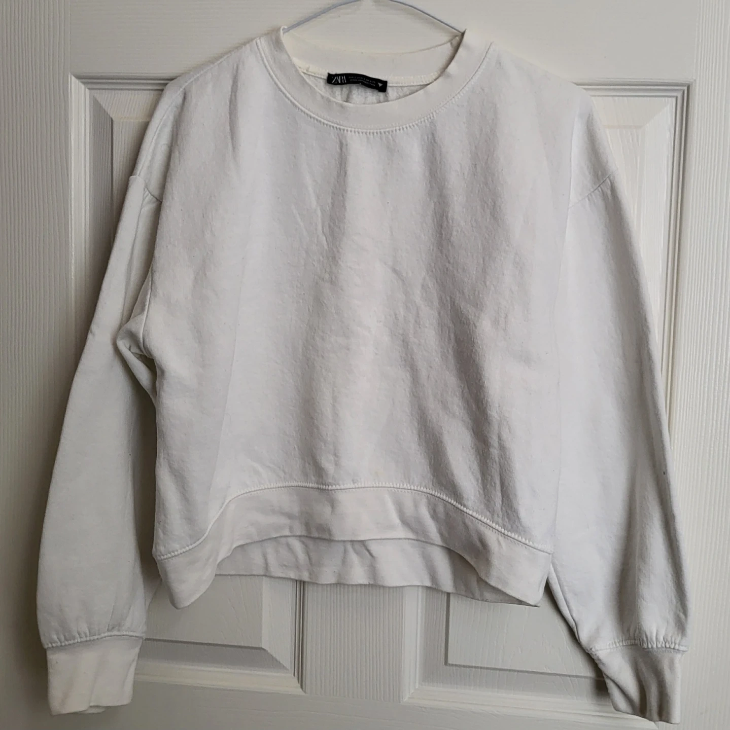This is a ZARA white crewneck sweatshirt. It's a size S. It's a comfy staple for any wardrobe!