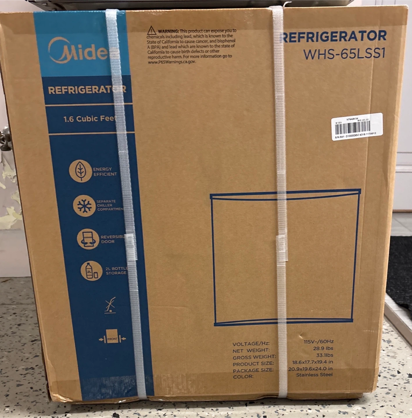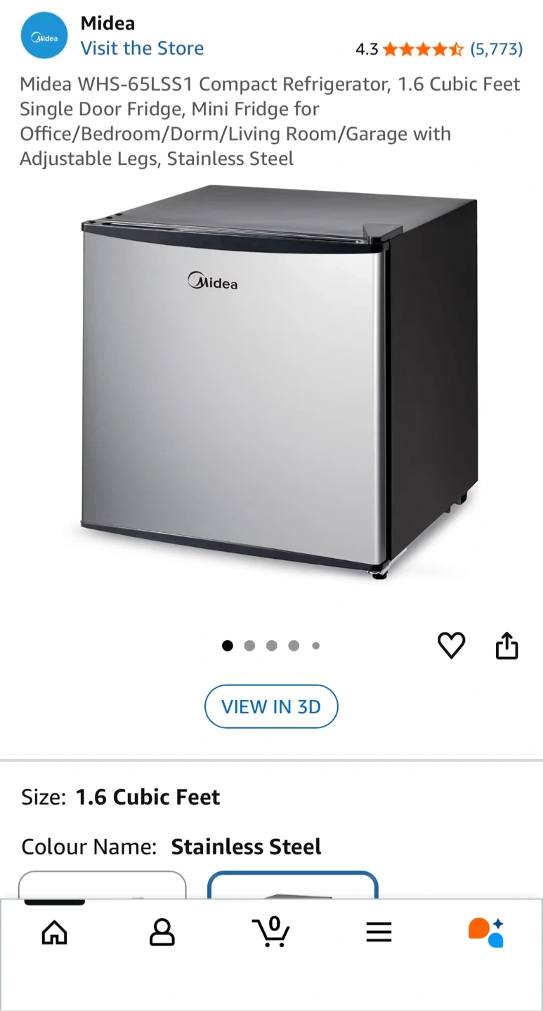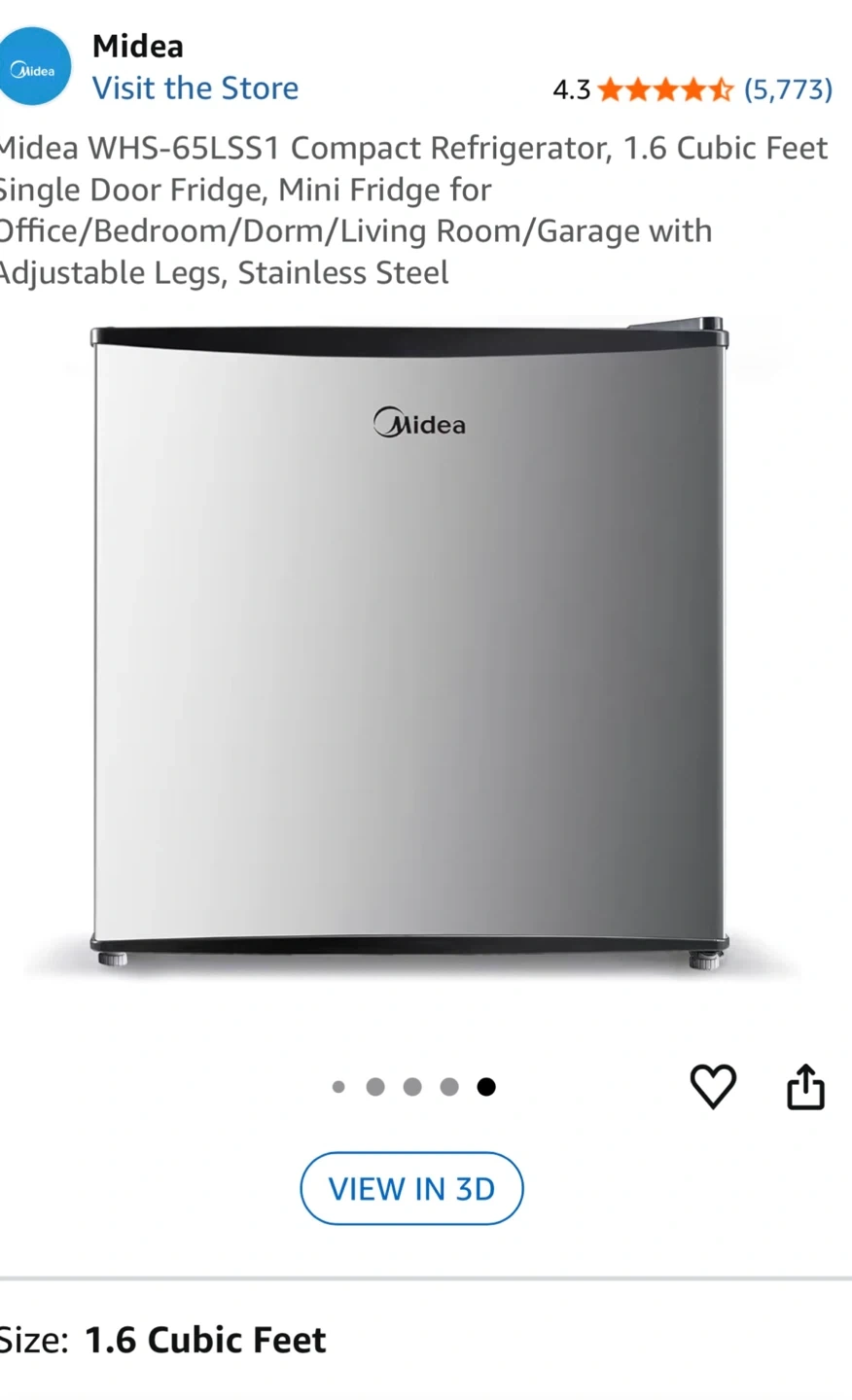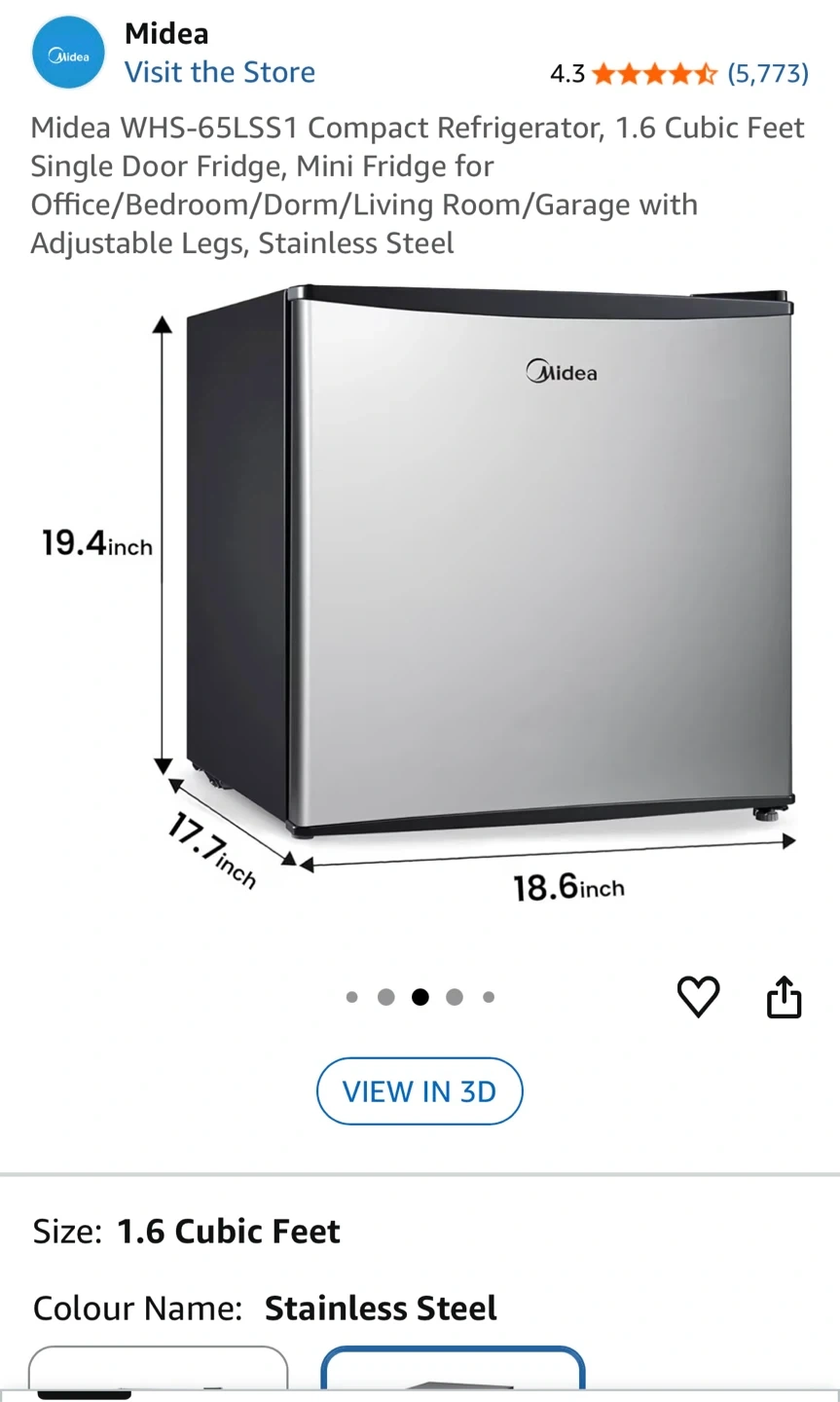 Selling a Midea compact refrigerator, perfect for a small space! It's 1.6 cubic feet, and the colour is stainless steel. This mini fridge is great for an office, bedroom, dorm, living room, or garage. It also has adjustable legs!