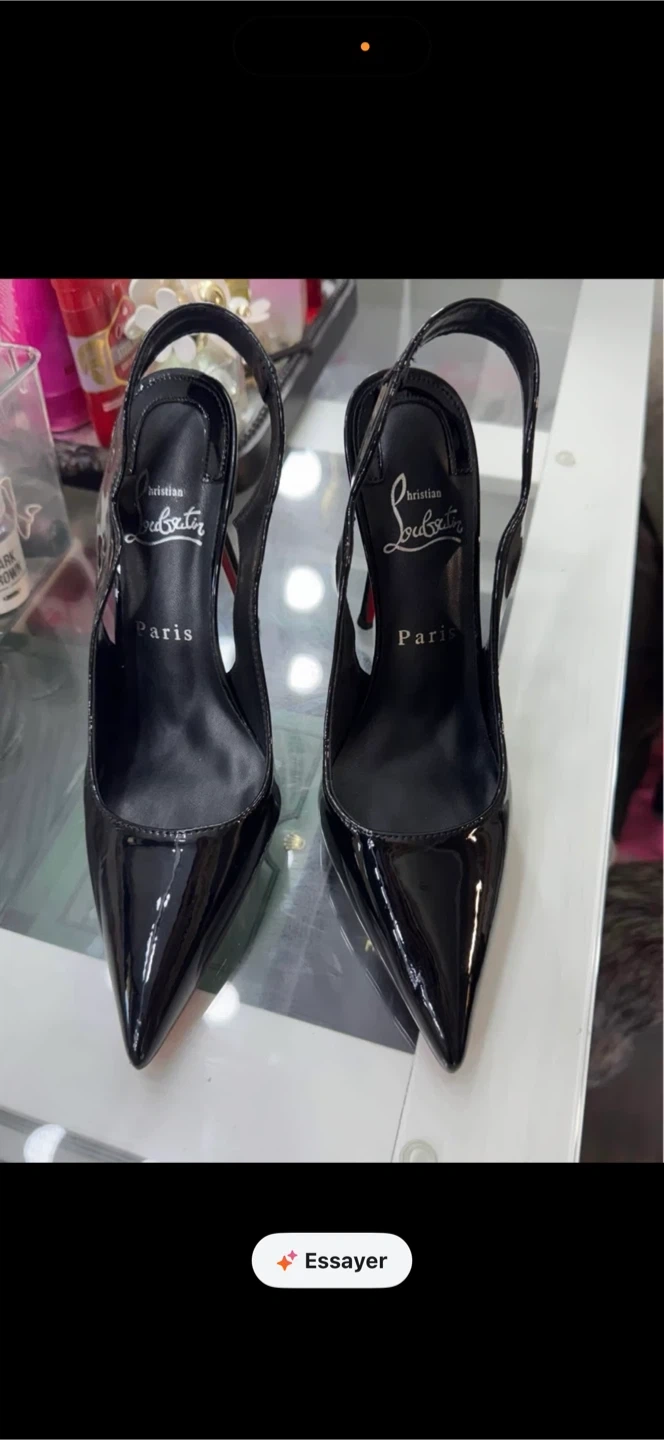 Christian Louboutin black patent leather slingback heels. Classic pointed toe design with the iconic red sole. These heels add a touch of elegance to any outfit.