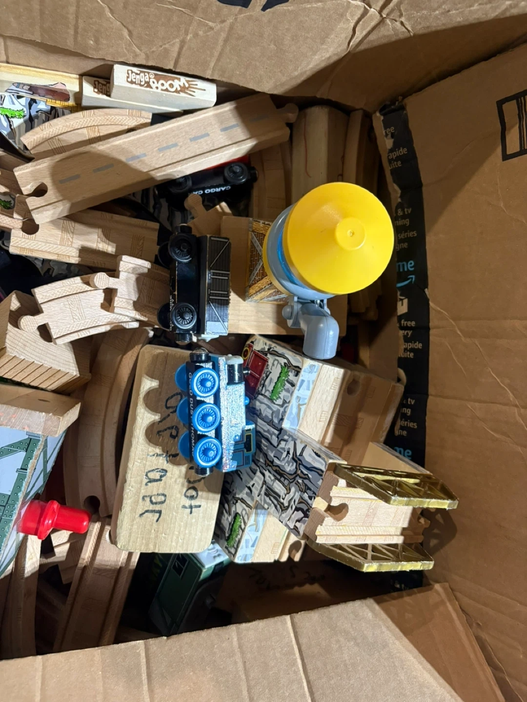 A collection of wooden train tracks and several train cars, including a blue engine and a cargo car. Some track pieces feature road designs and elevated sections. Also includes a yellow light accessory and a red piece. Great for building imaginative train layouts!