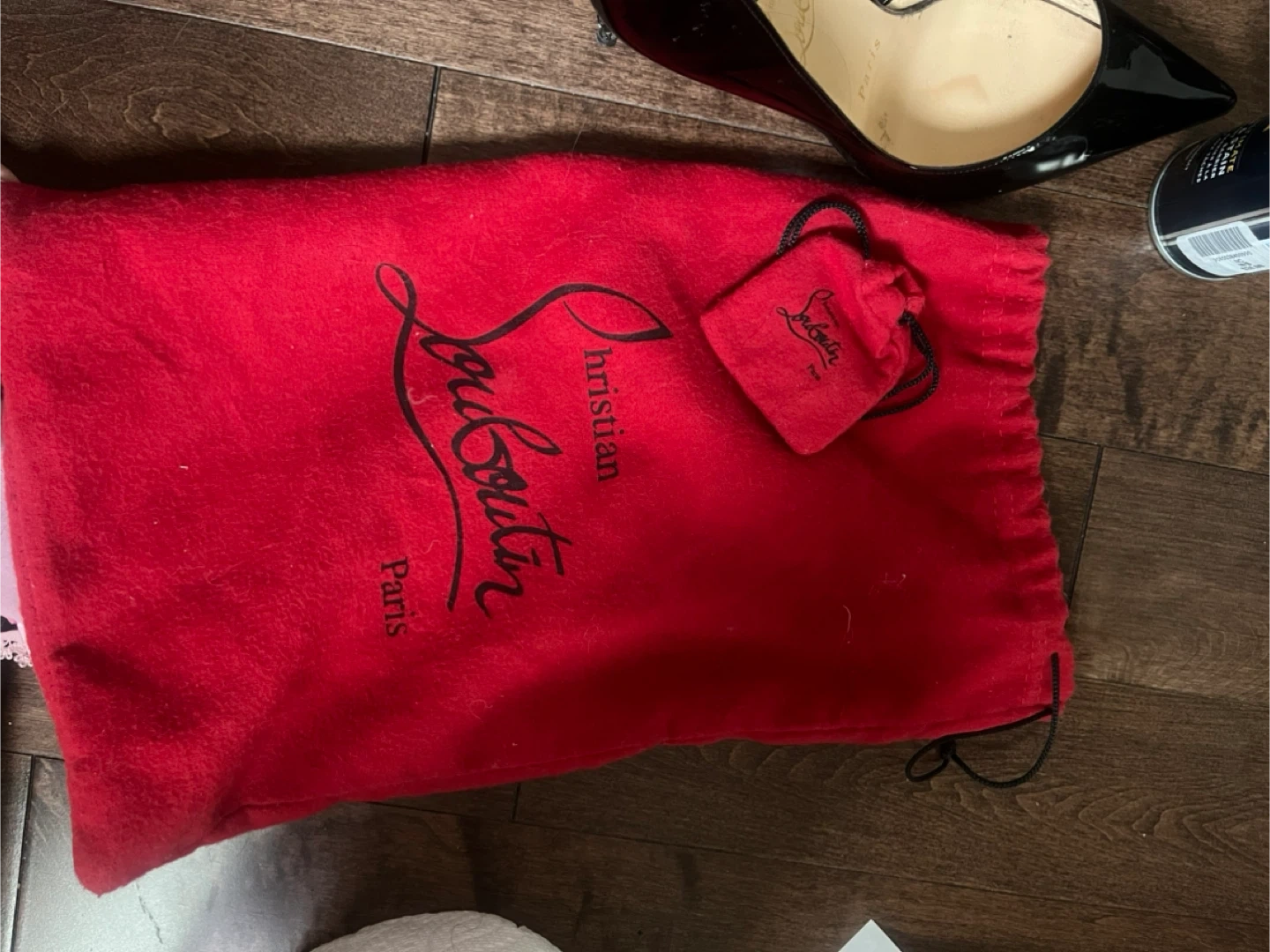 Classic authentic Christian Louboutin heels in black patent leather. Comes with a dust bag and small pouch with extra heel covers. Heel height is approximately 4 inches.