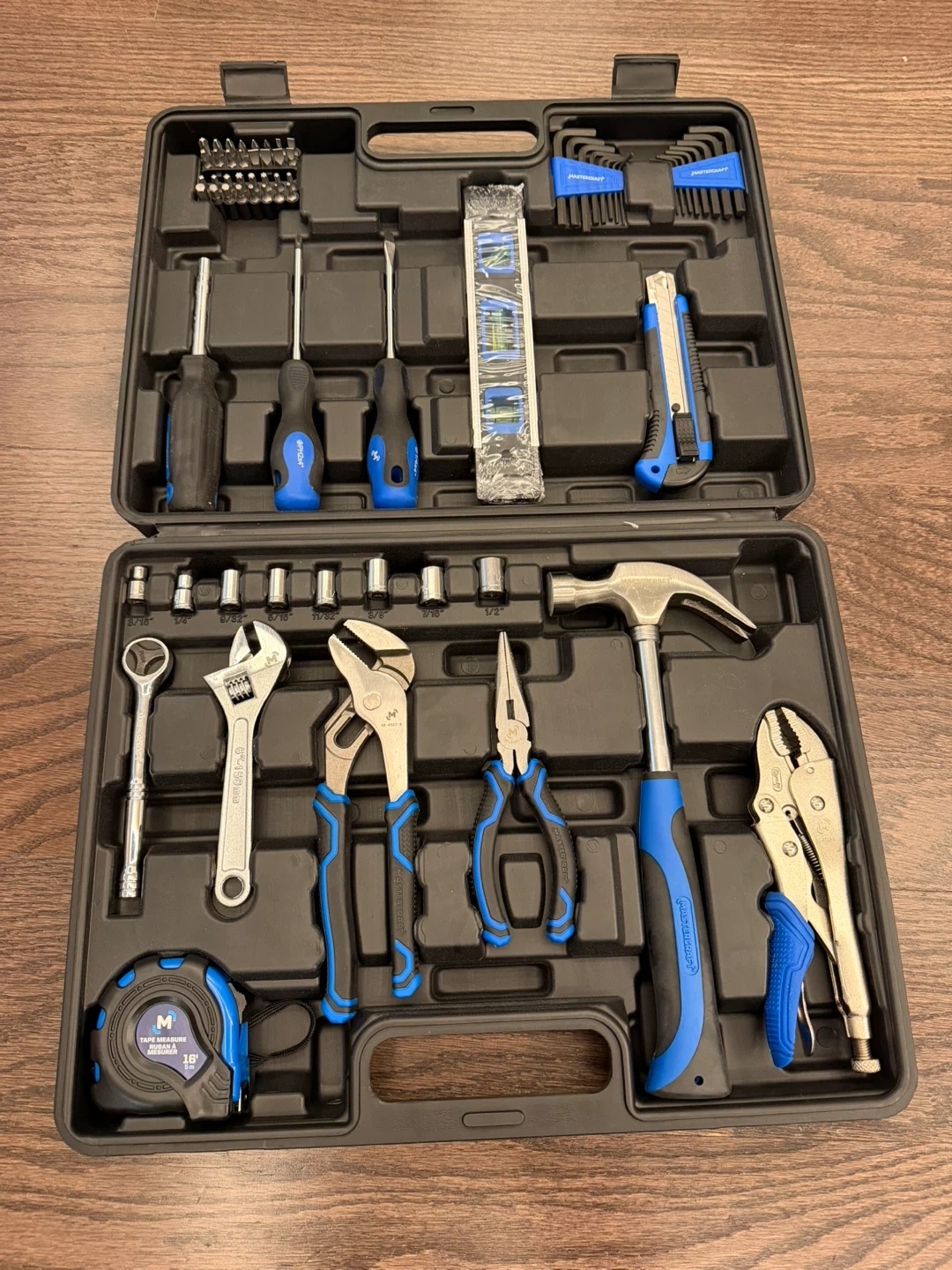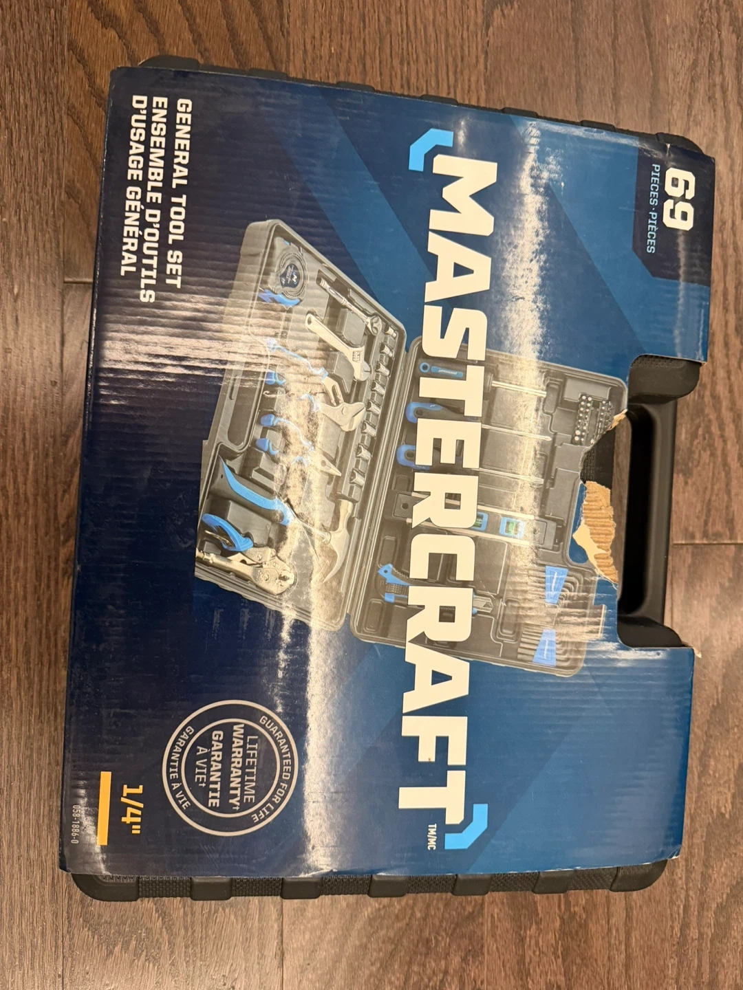 *BRAND NEW* Mastercraft 69-piece general tool set. Includes various wrenches, pliers, screwdrivers, sockets, and a hammer. Comes in a durable carrying case. 1/4" drive size.