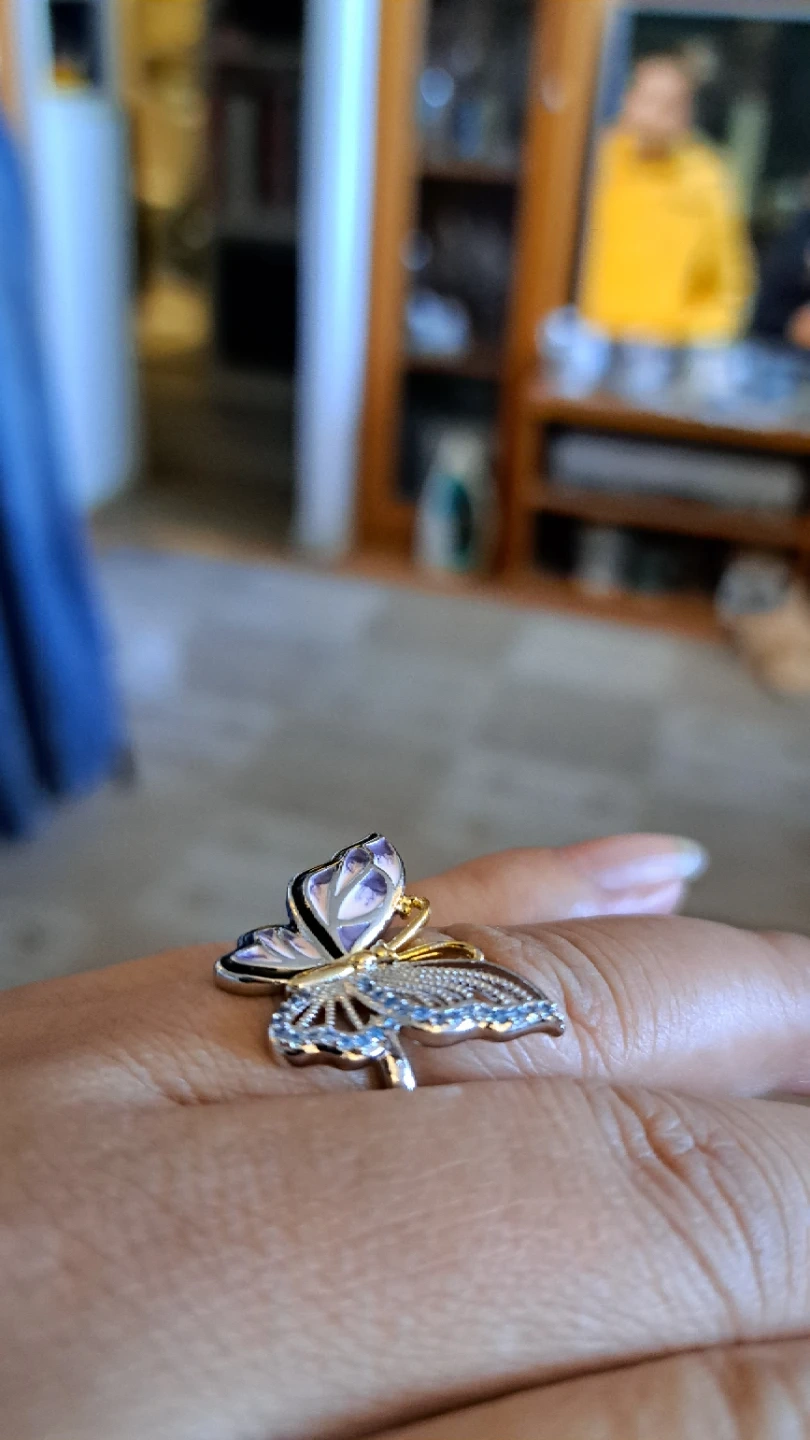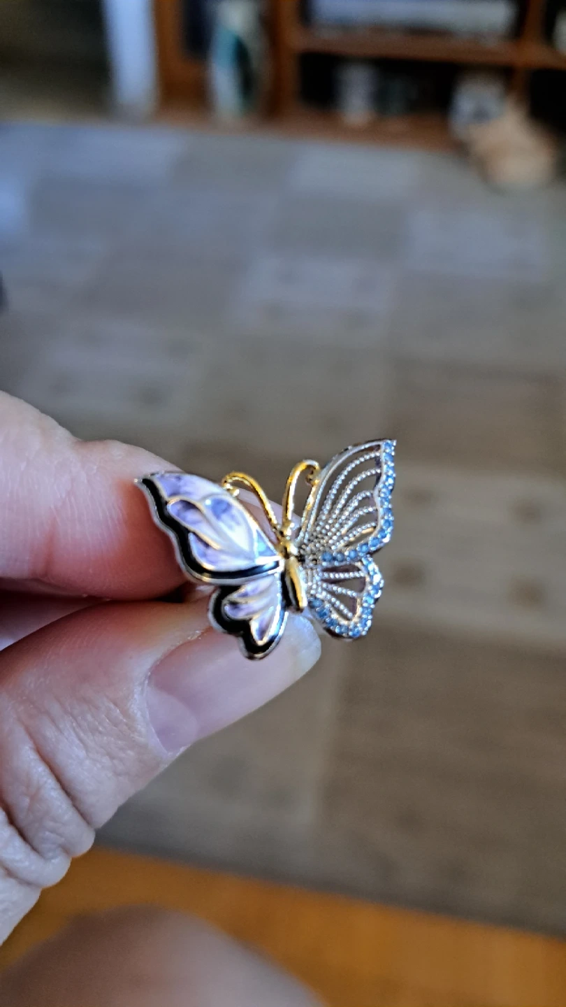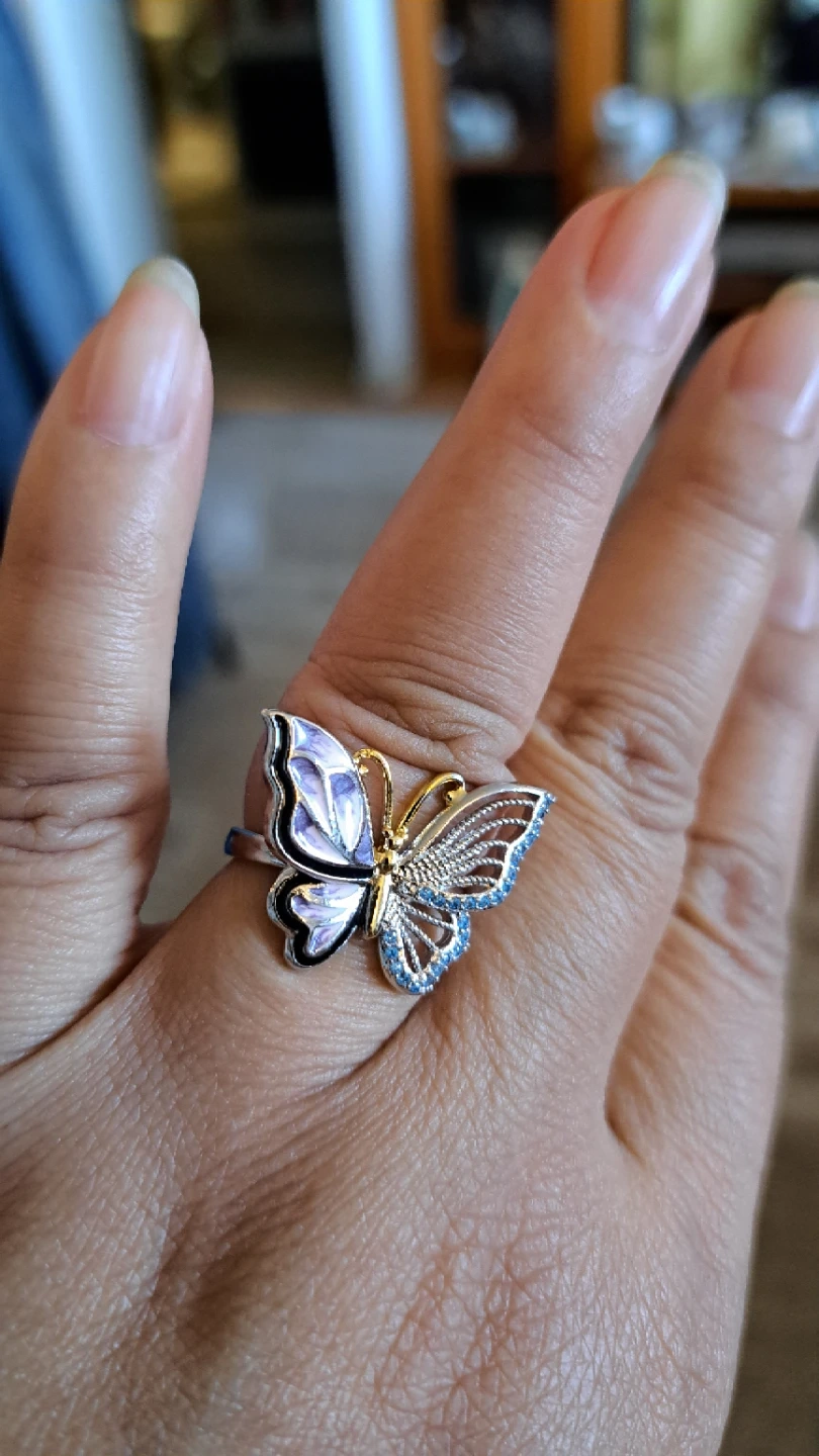 A lovely ring designed as a butterfly. It features delicate blue stones on the wings and purple enamel detailing. It's a stylish accessory for any occasion!