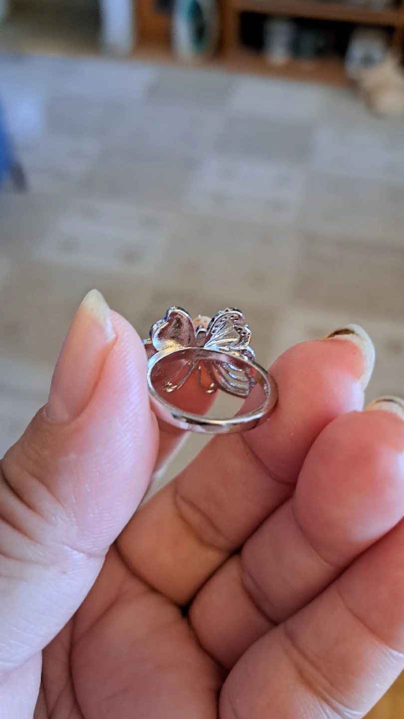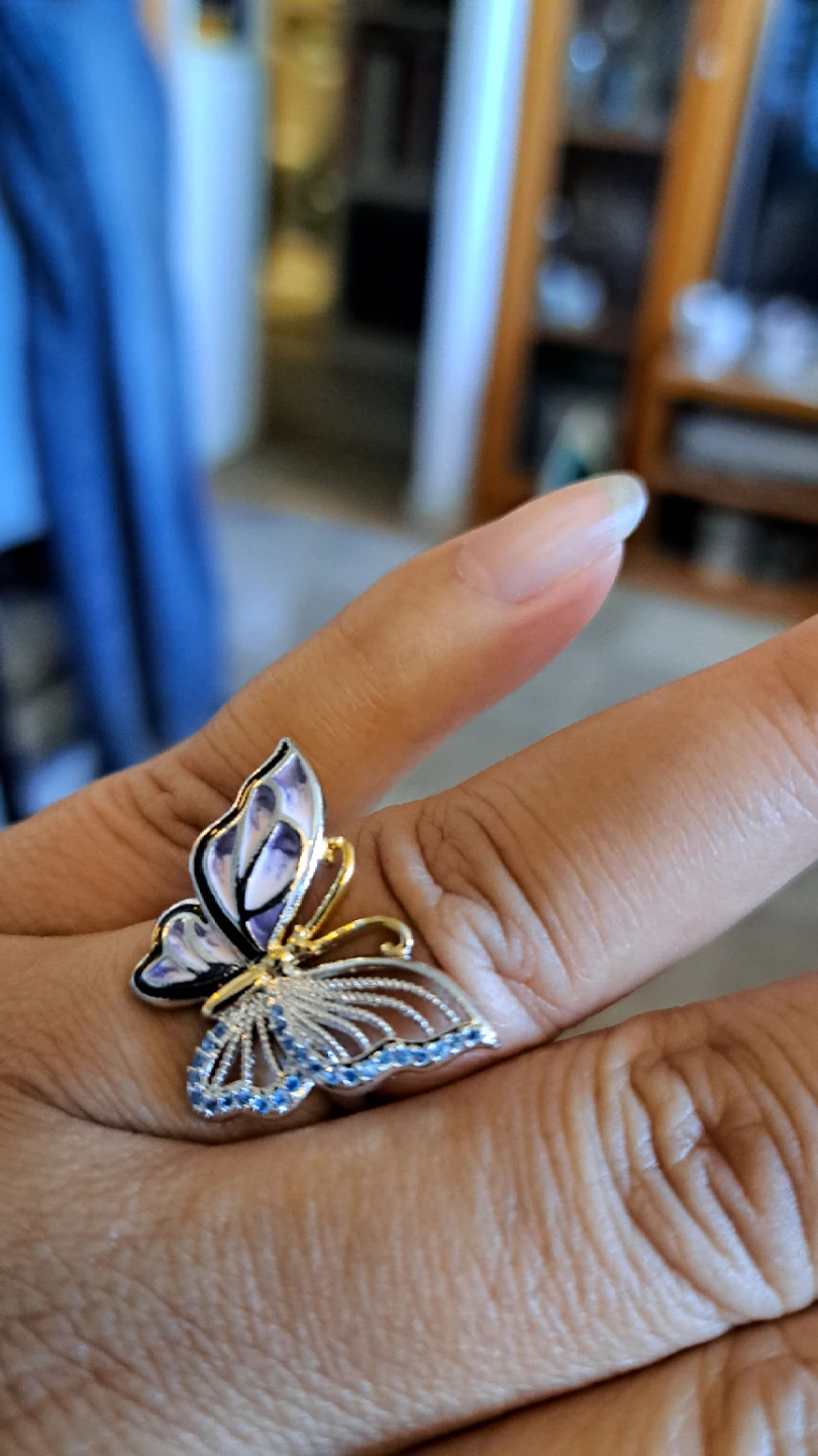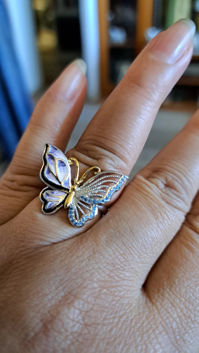 A lovely ring designed as a butterfly. It features delicate blue stones on the wings and purple enamel detailing. It's a stylish accessory for any occasion!
