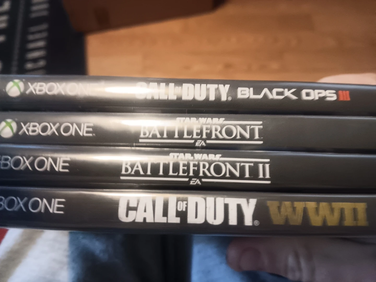 four Xbox One games: Call of Duty Black Ops III, Star Wars Battlefront, Star Wars Battlefront II, and Call of Duty WWII. Games are for the Xbox One console. $30.00 each