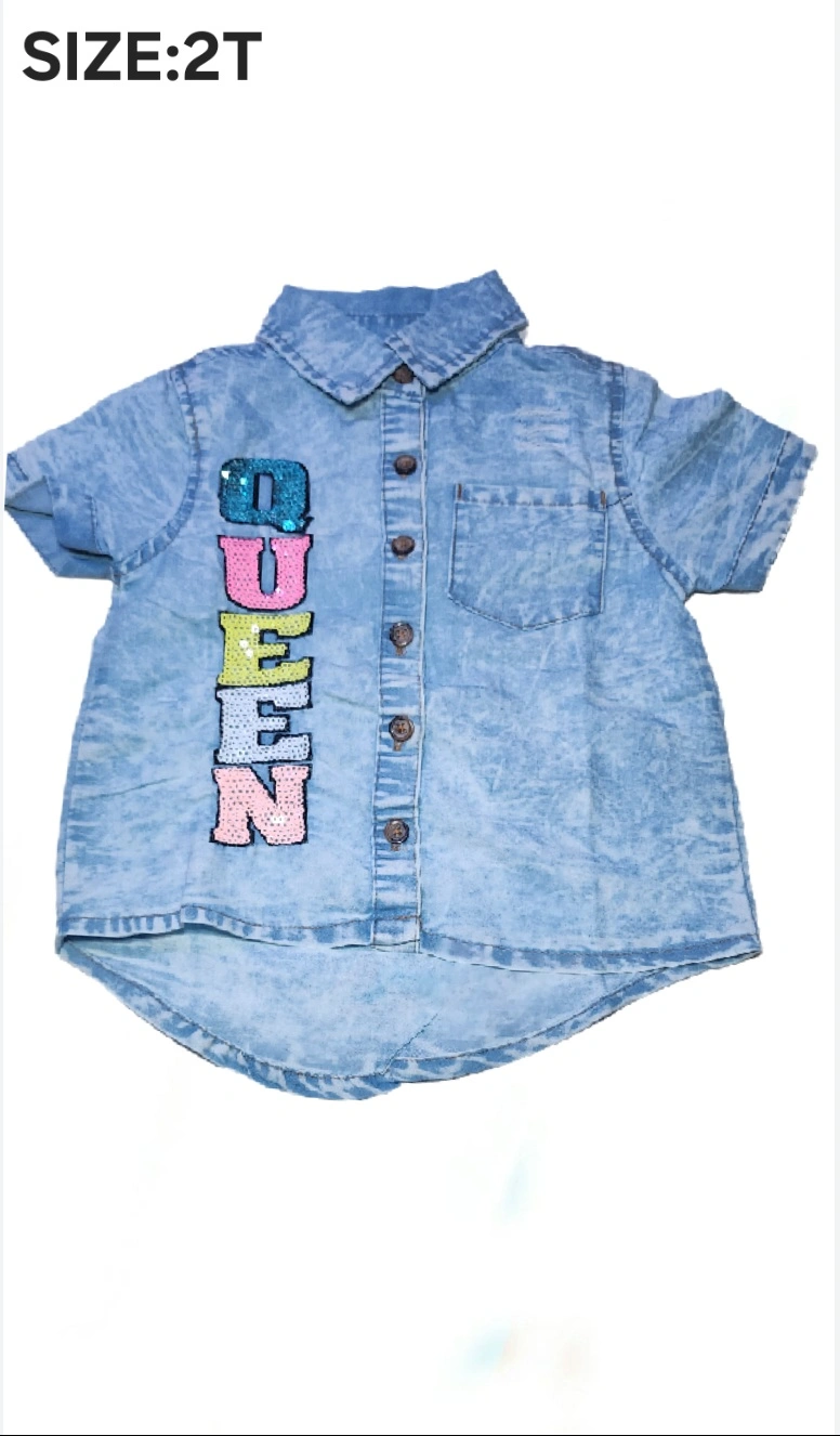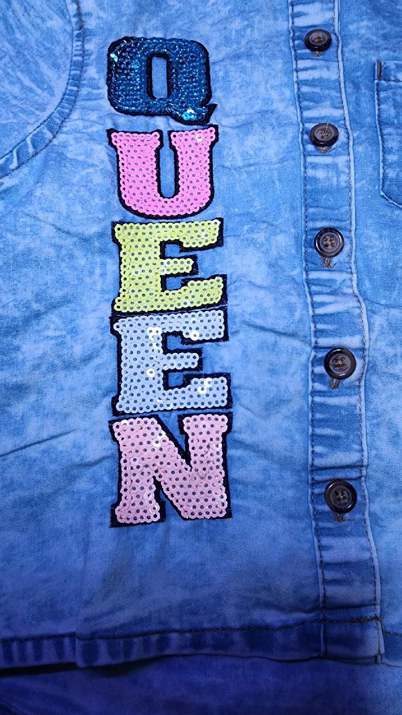 Cute denim button-up shirt for toddlers! It's in great condition and features a fun, sequined 'QUEEN' design down the front. Perfect for your little one!