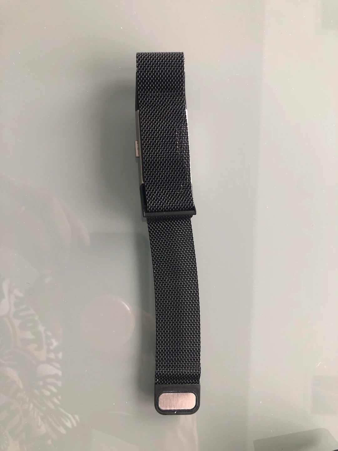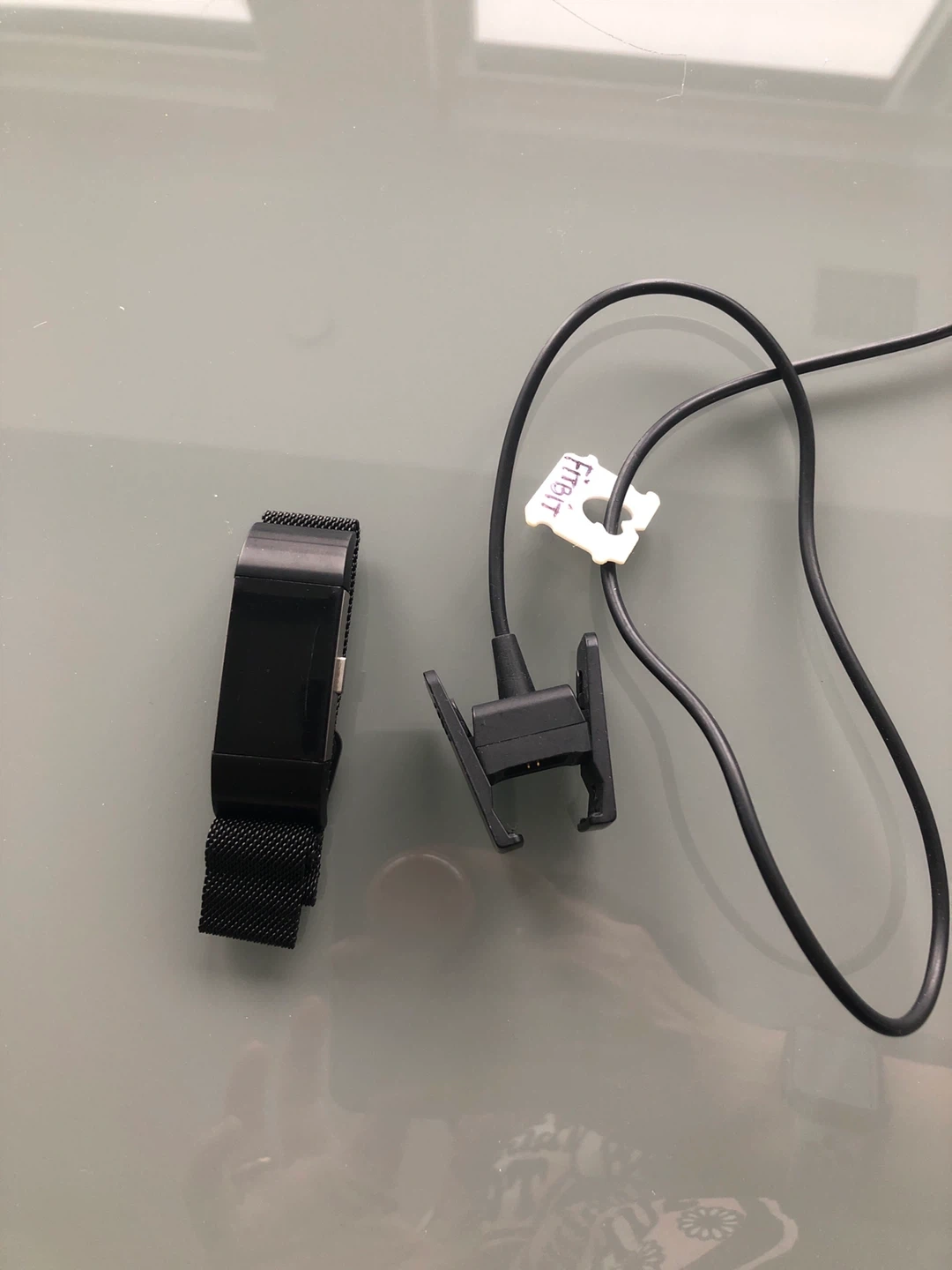 This is a black Fitbit Charge 3 activity tracker with a mesh band. It comes with its original charging cable. It's a great way to track your daily activity and workouts!