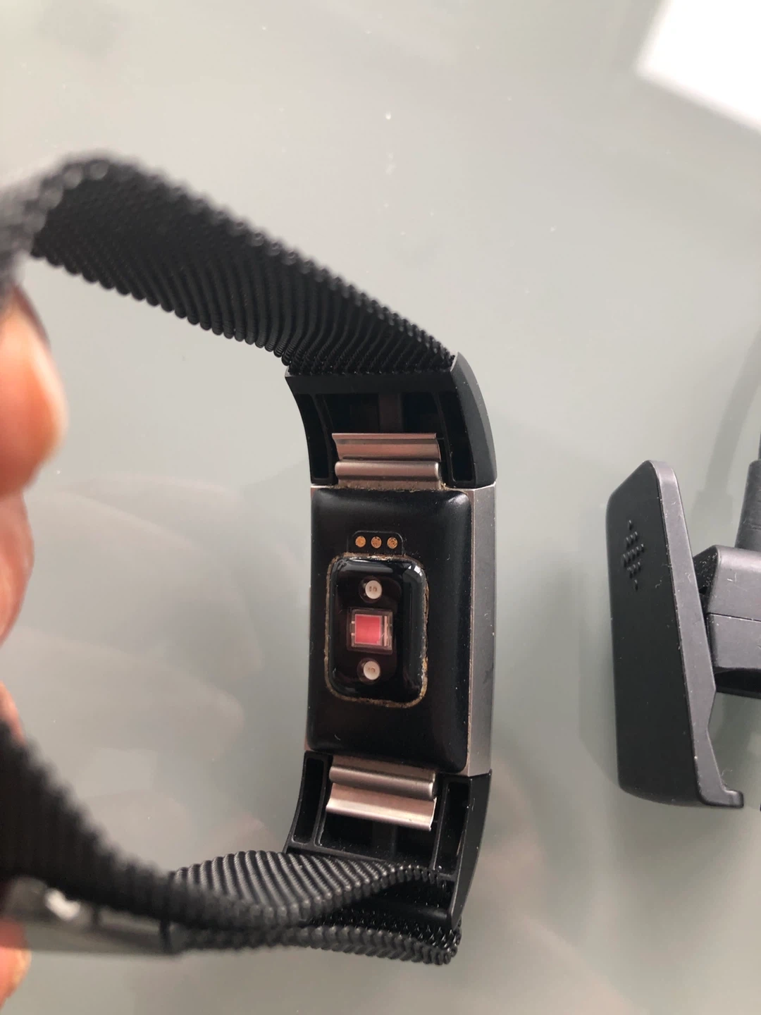 This is a black Fitbit Charge 3 activity tracker with a mesh band. It comes with its original charging cable. It's a great way to track your daily activity and workouts!