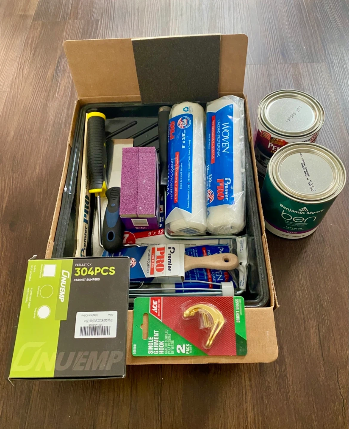 Here's a painting supplies kit that includes a can of Benjamin Moore interior paint and Premier Pro rollers and brushes! Also included are peel-and-stick cabinet bumpers and an Ace single garment hook. Everything you need for a quick home project!