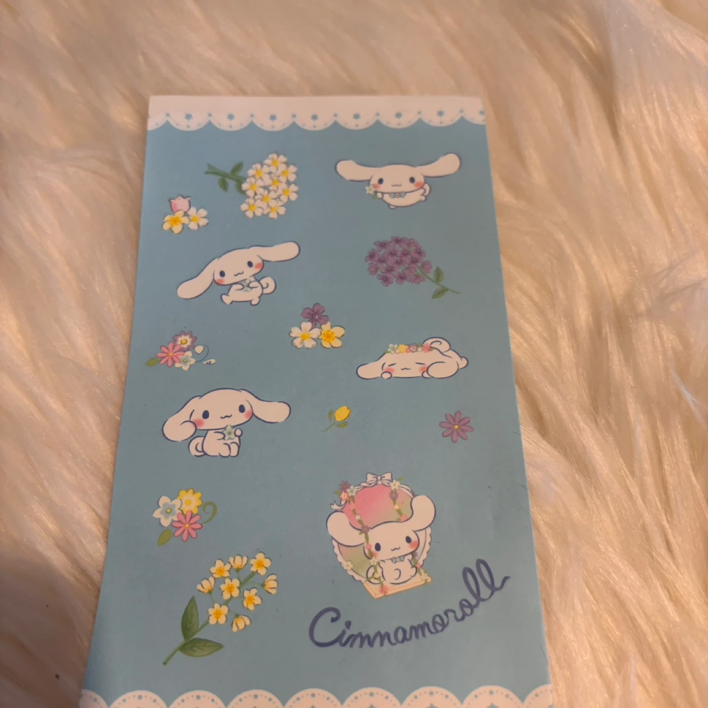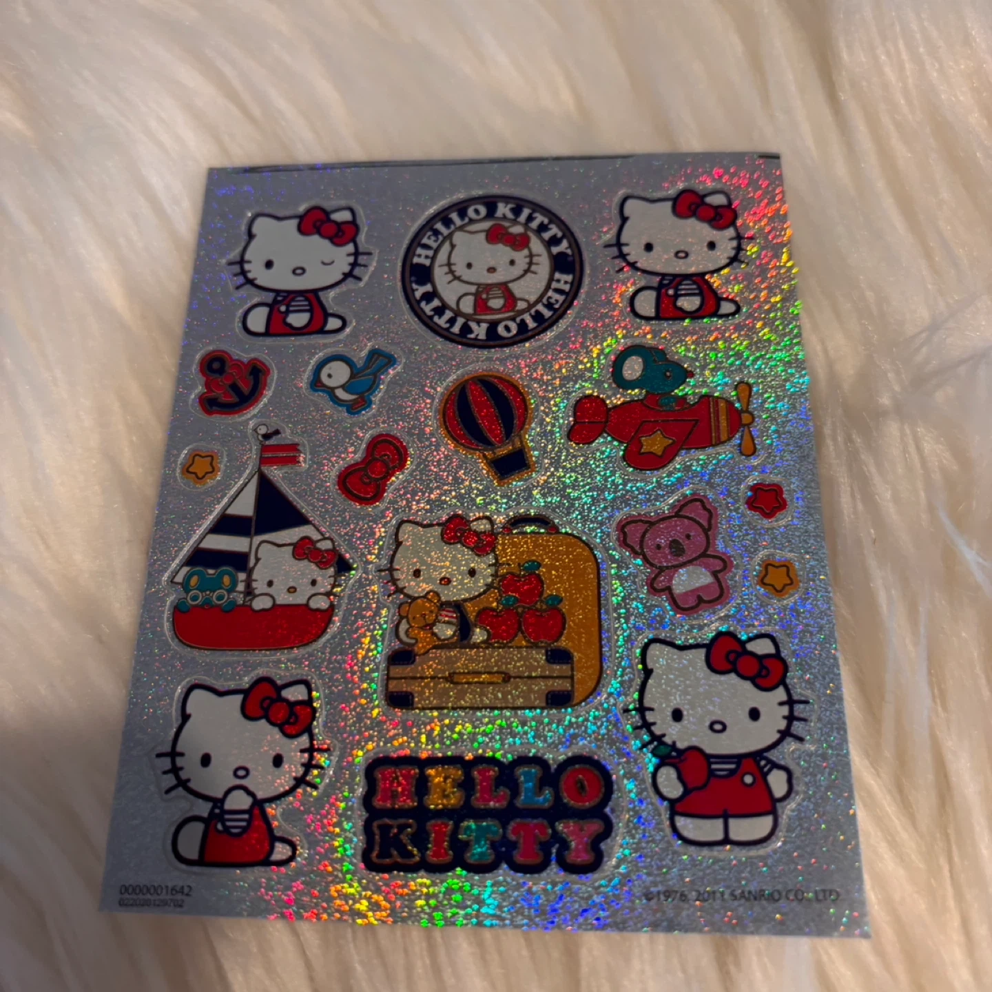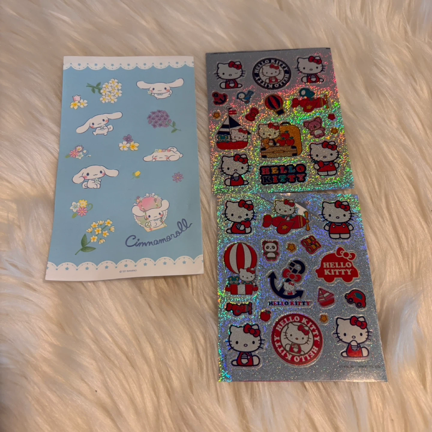 This set includes a Cinnamoroll notepad and two sheets of sparkly Hello Kitty stickers. The stickers feature various cute Hello Kitty designs. It's great for decorating journals, cards, or crafts!