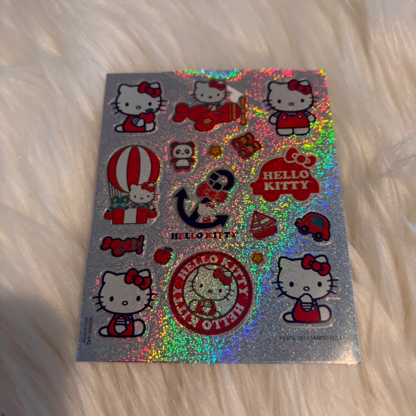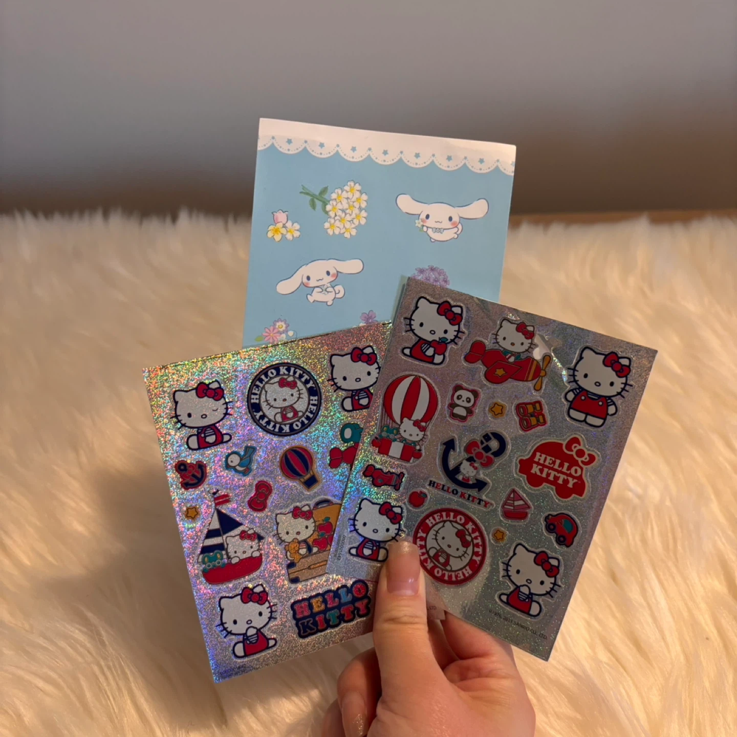 This set includes a Cinnamoroll notepad and two sheets of sparkly Hello Kitty stickers. The stickers feature various cute Hello Kitty designs. It's great for decorating journals, cards, or crafts!