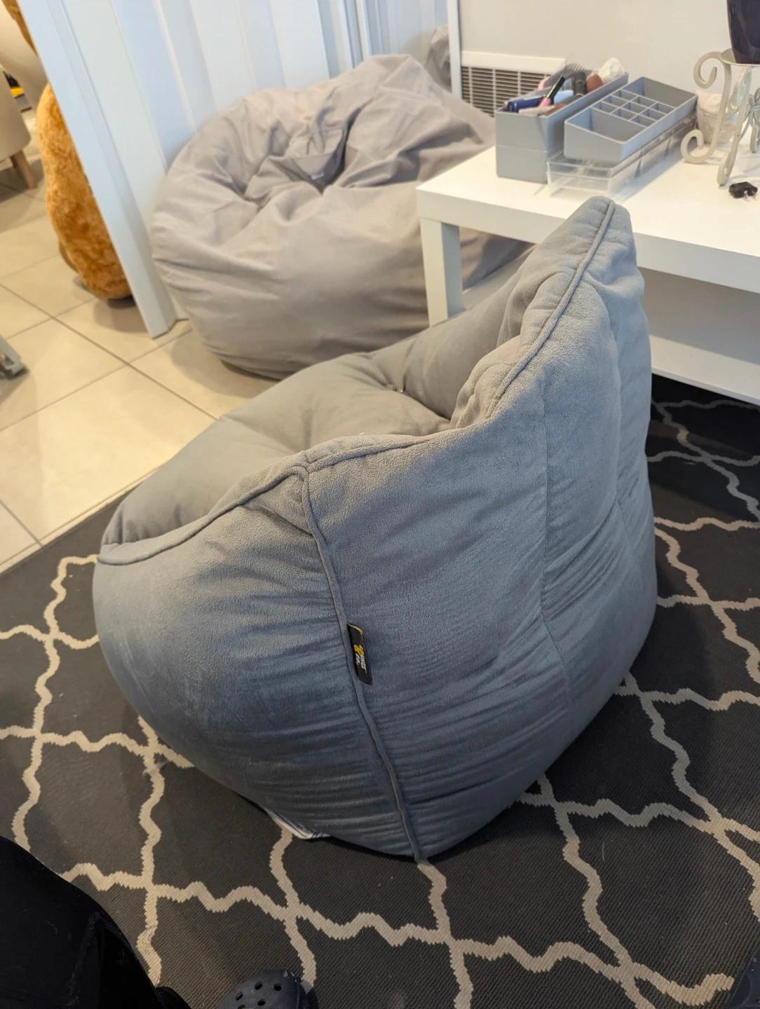 Comfortable grey bean bag chair with a soft, velvety texture. It's great for lounging and gaming. Made with a durable, plush fabric.