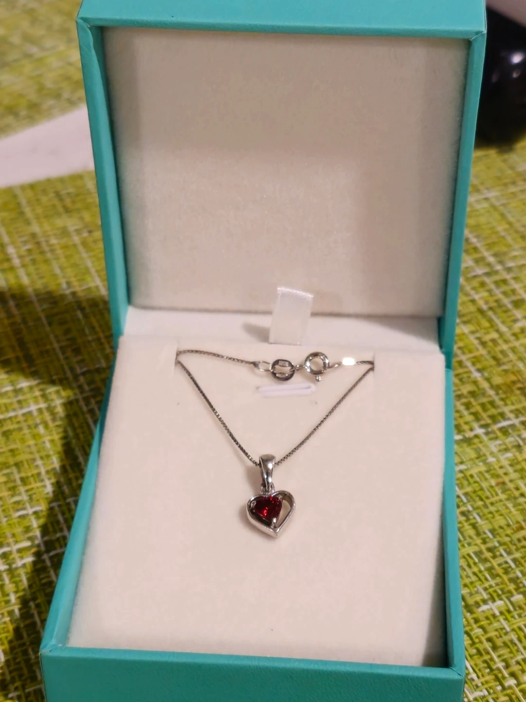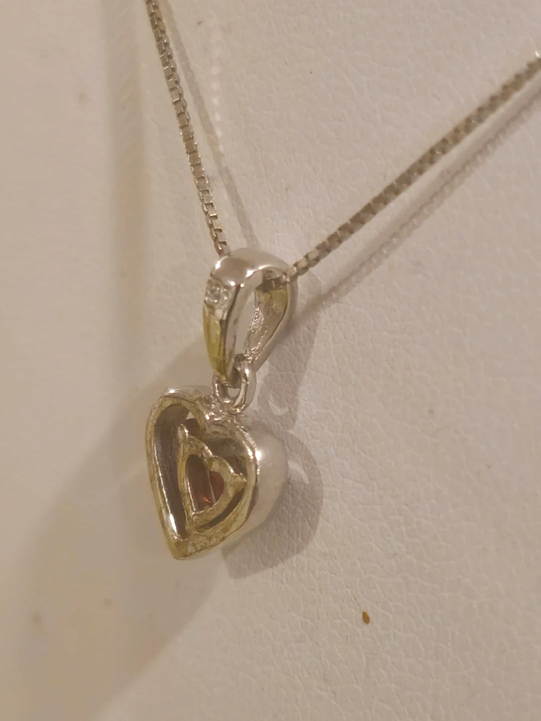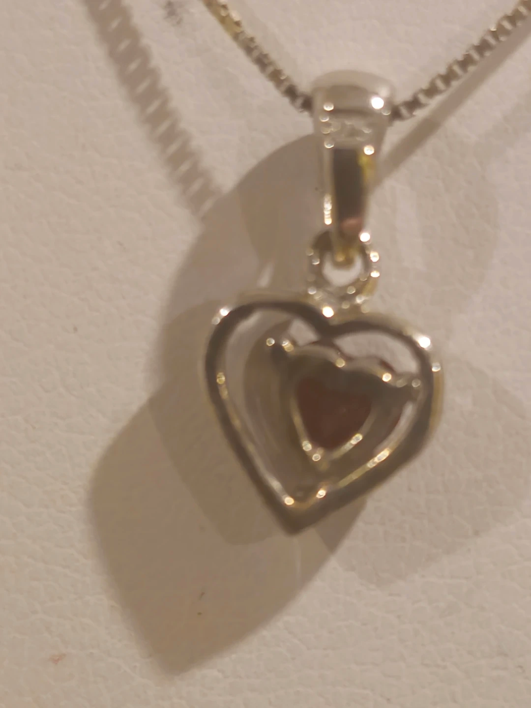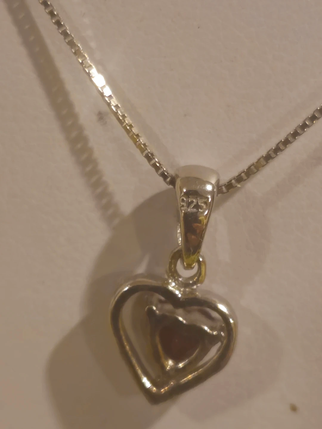 A lovely sterling silver necklace with a heart-shaped pendant featuring a deep red garnet stone. The chain is a delicate box style. It comes presented in a nice gift box.