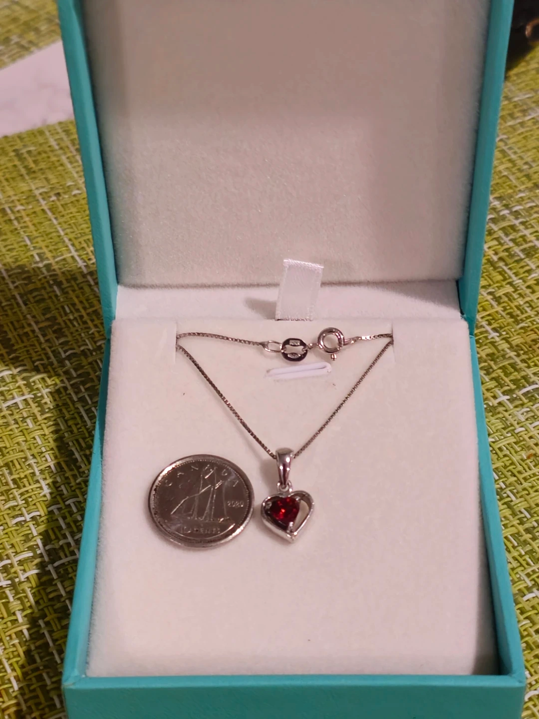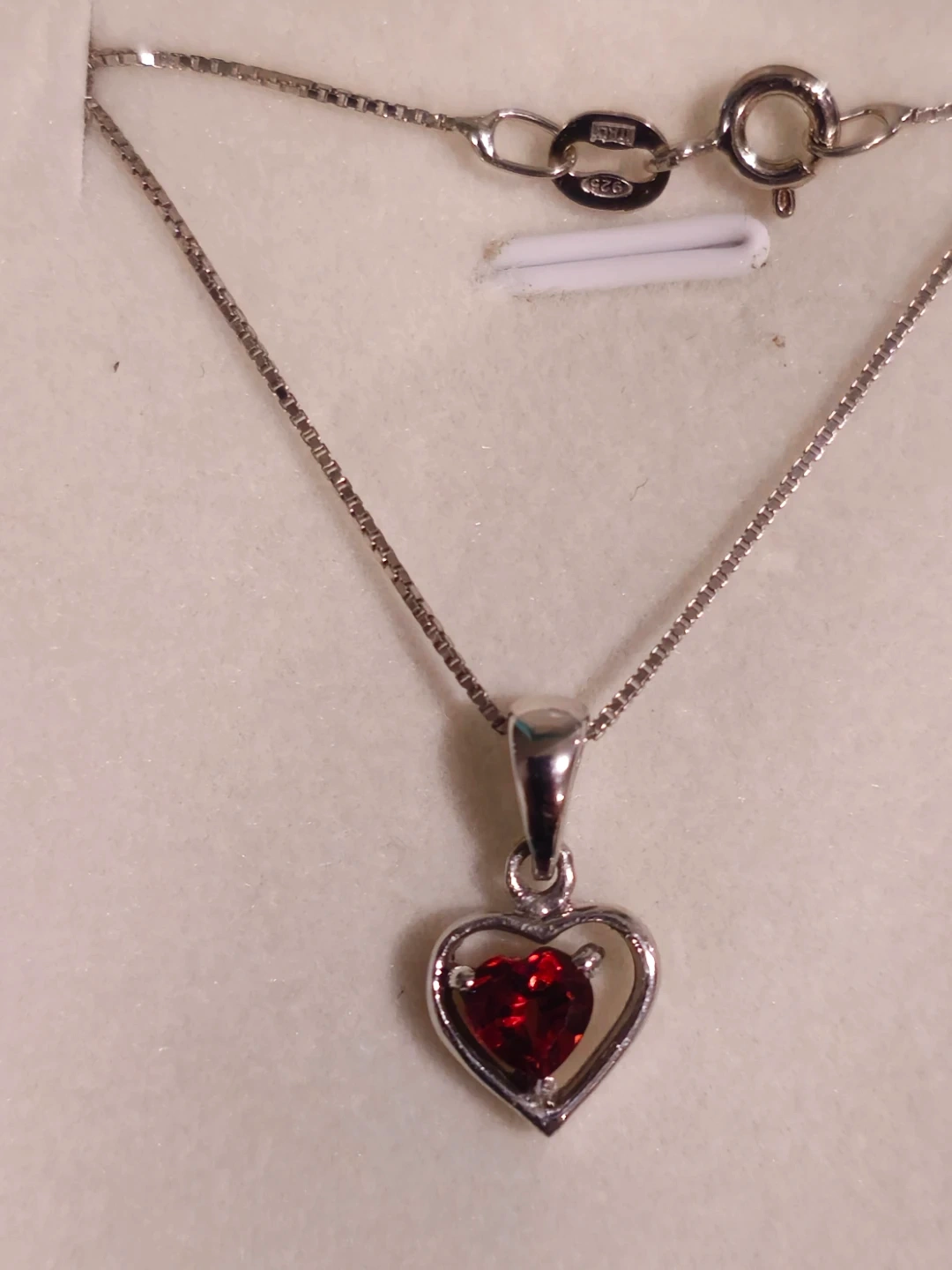 A lovely sterling silver necklace with a heart-shaped pendant featuring a deep red garnet stone. The chain is a delicate box style. It comes presented in a nice gift box.