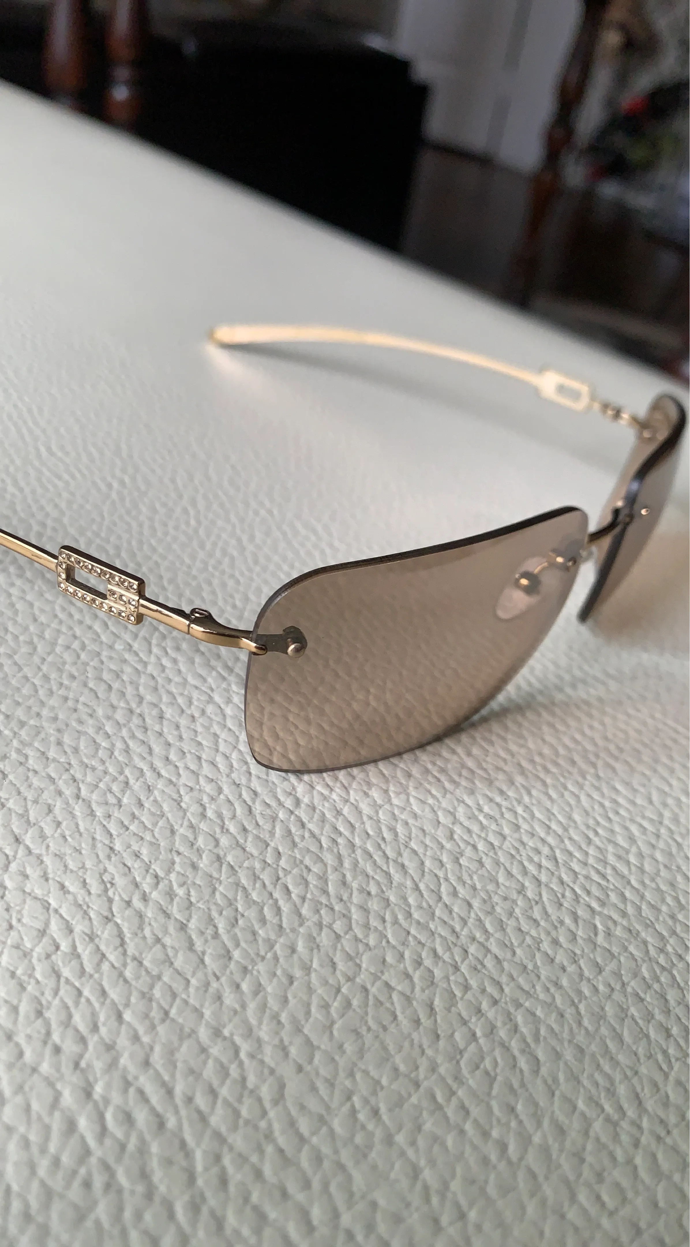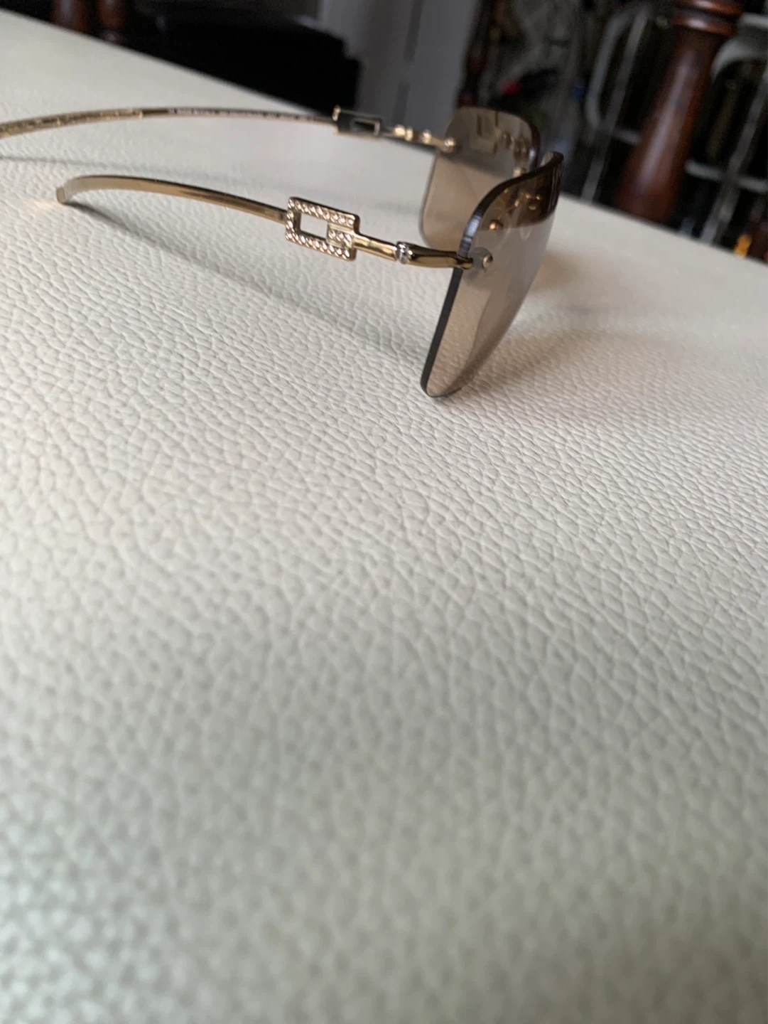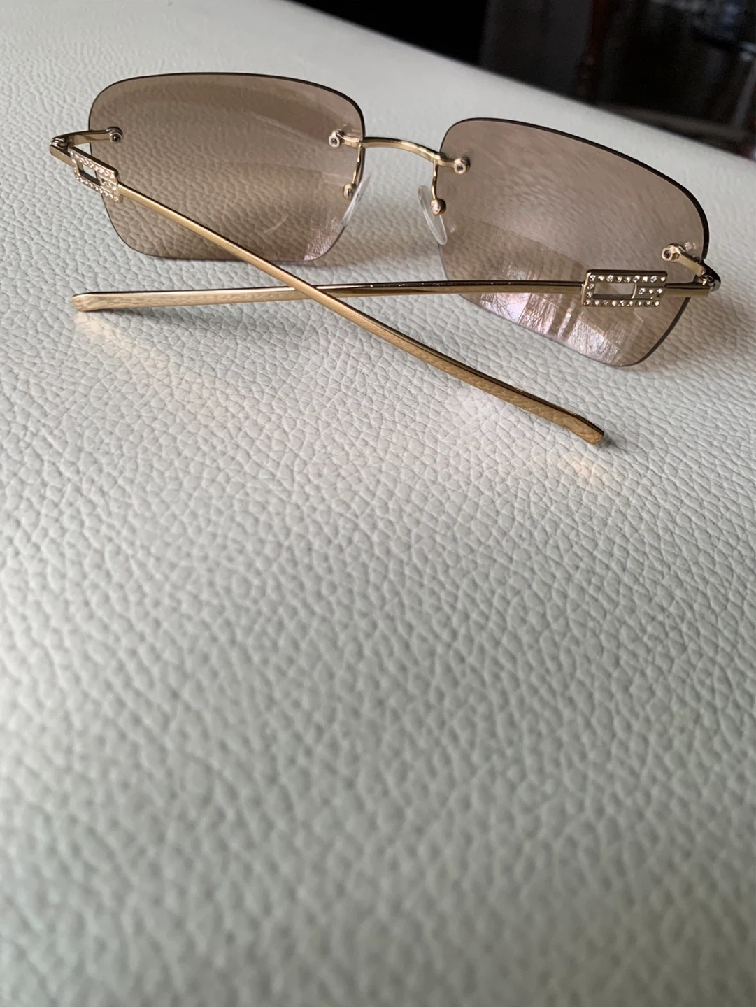 These are Gucci rimless sunglasses with a gold-tone frame. They feature brown gradient lenses and decorative detailing on the arms. A stylish accessory for sunny days!