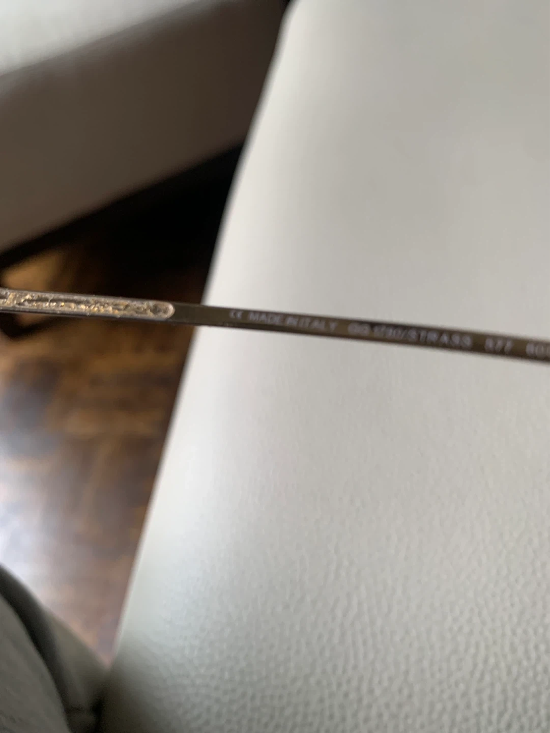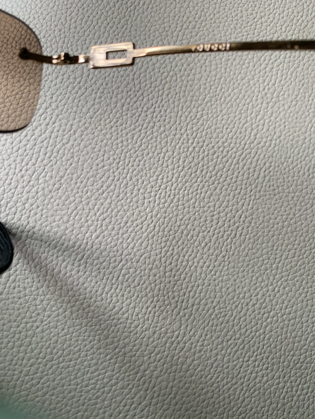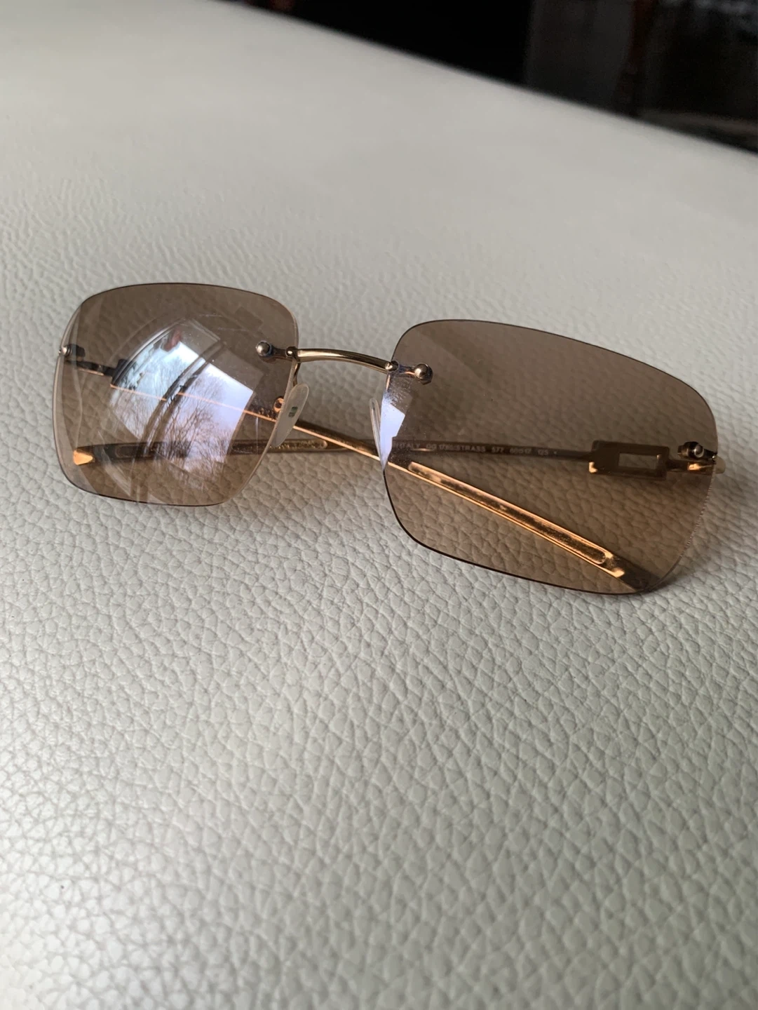 These are Gucci rimless sunglasses with a gold-tone frame. They feature brown gradient lenses and decorative detailing on the arms. A stylish accessory for sunny days!