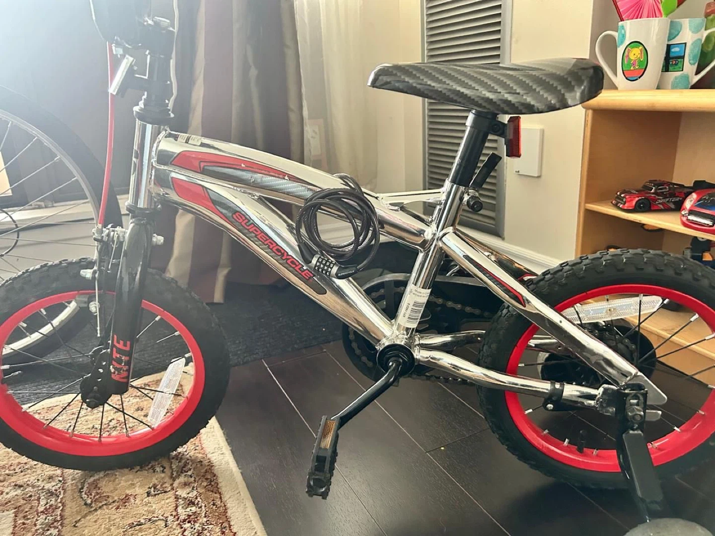 Selling a Supercycle bike in good condition. The frame is silver with red accents on the tires. It also comes with a bike lock