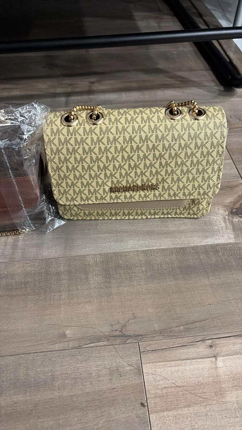 This is a Michael Kors shoulder bag with the signature MK monogram print. It features a gold-tone chain strap and hardware. The bag is beige and brown.