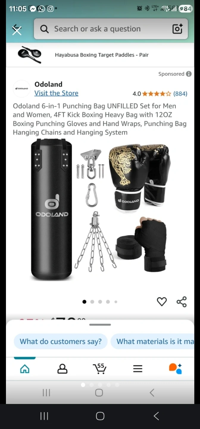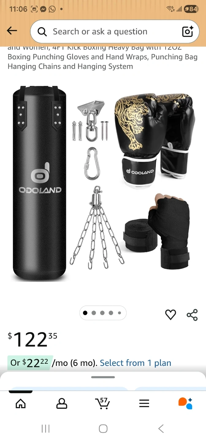 I'm selling a brand new Odoland 6-in-1 unfilled punching bag set! It's a 4FT kickboxing heavy bag designed for both men and women. The set includes 12oz boxing punching gloves, hand wraps, hanging chains, and a hanging system. The original price was $79.89 and it comes in the original box