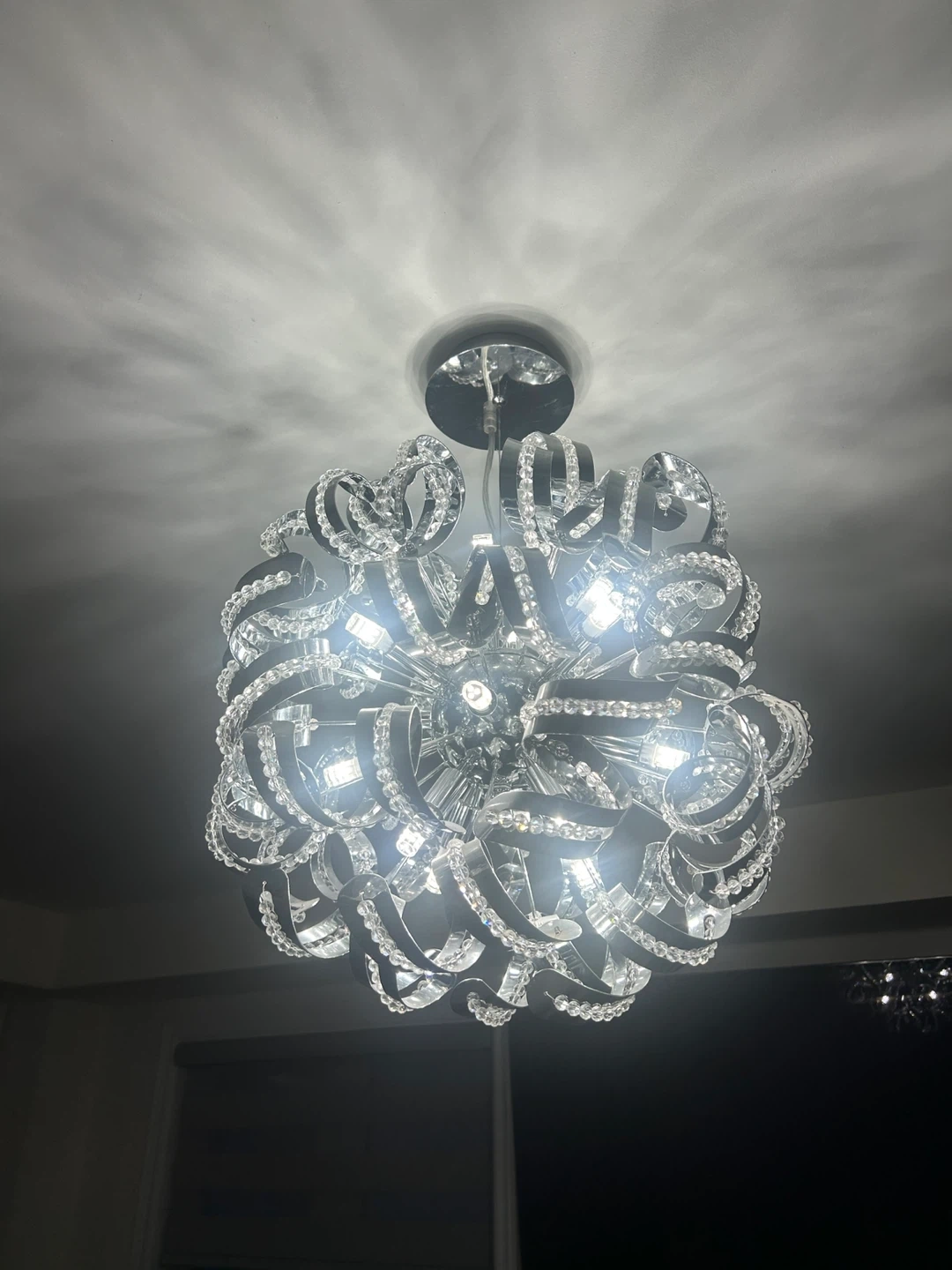 Decorative pendant light fixture with multiple crystal accents and metallic swirls. It's a stylish addition to any room, providing ample illumination. This light is suitable for living rooms or dining areas.