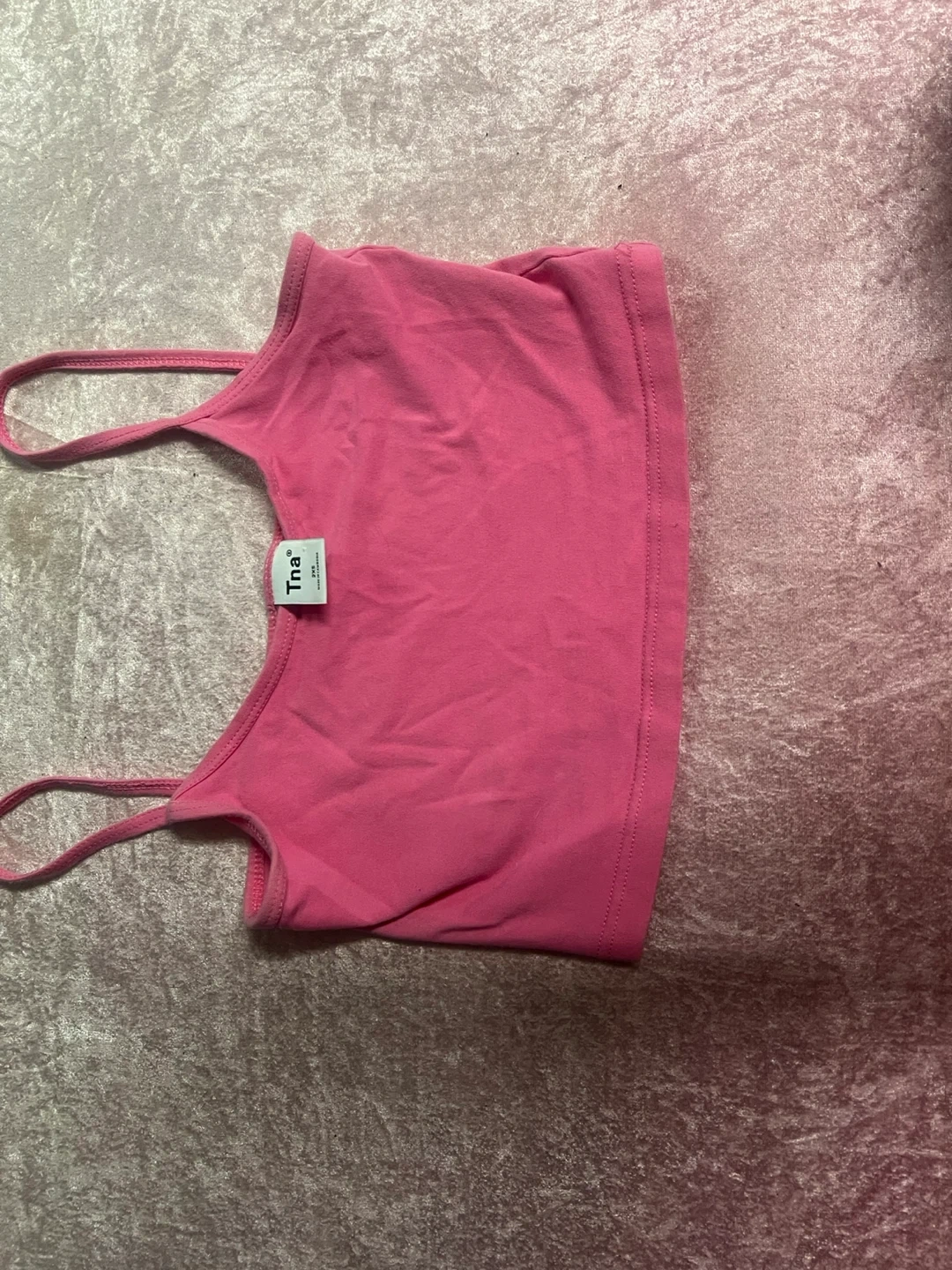 This is a pink spaghetti strap crop top from Tna. It's made of a soft, stretchy material. Perfect for layering or wearing on its own during warmer weather!