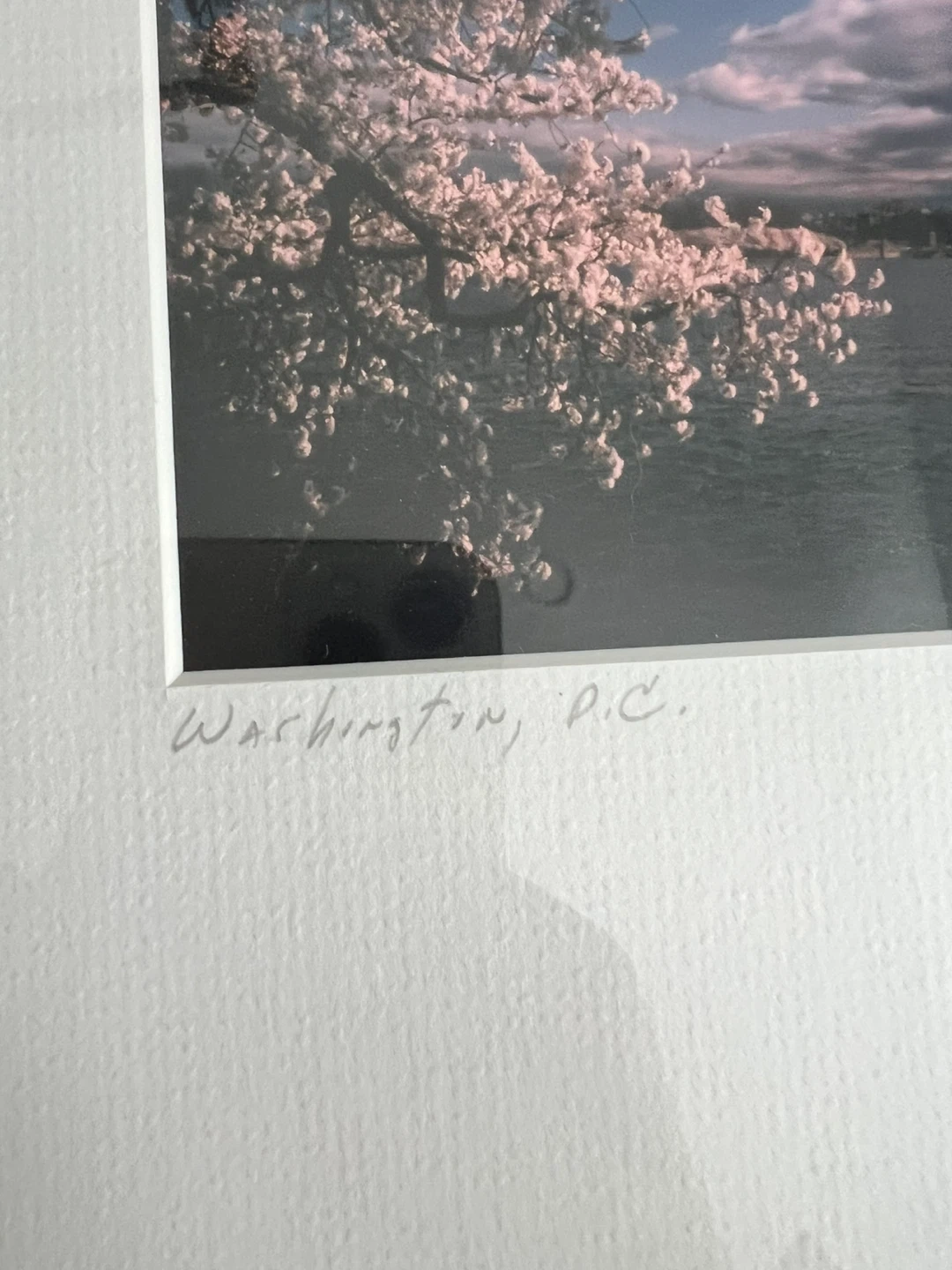 scenes featuring cherry blossoms. Includes images of the Jefferson Memorial, the Capitol building, and the Washington Monument. Signed by the artist, Larry E. Hansen.