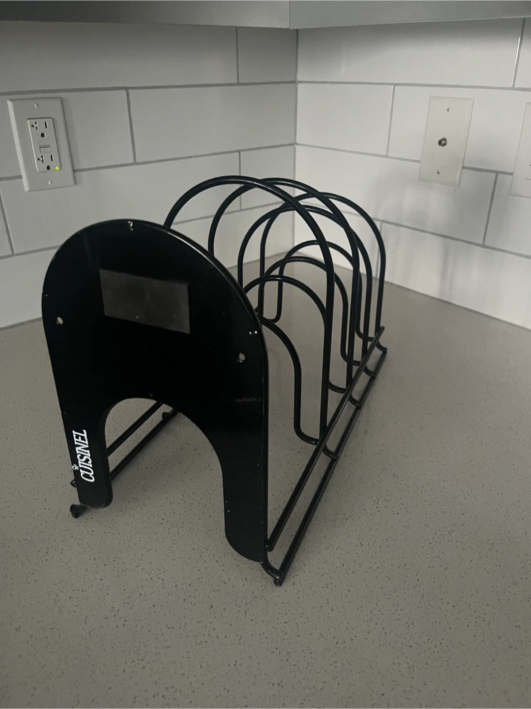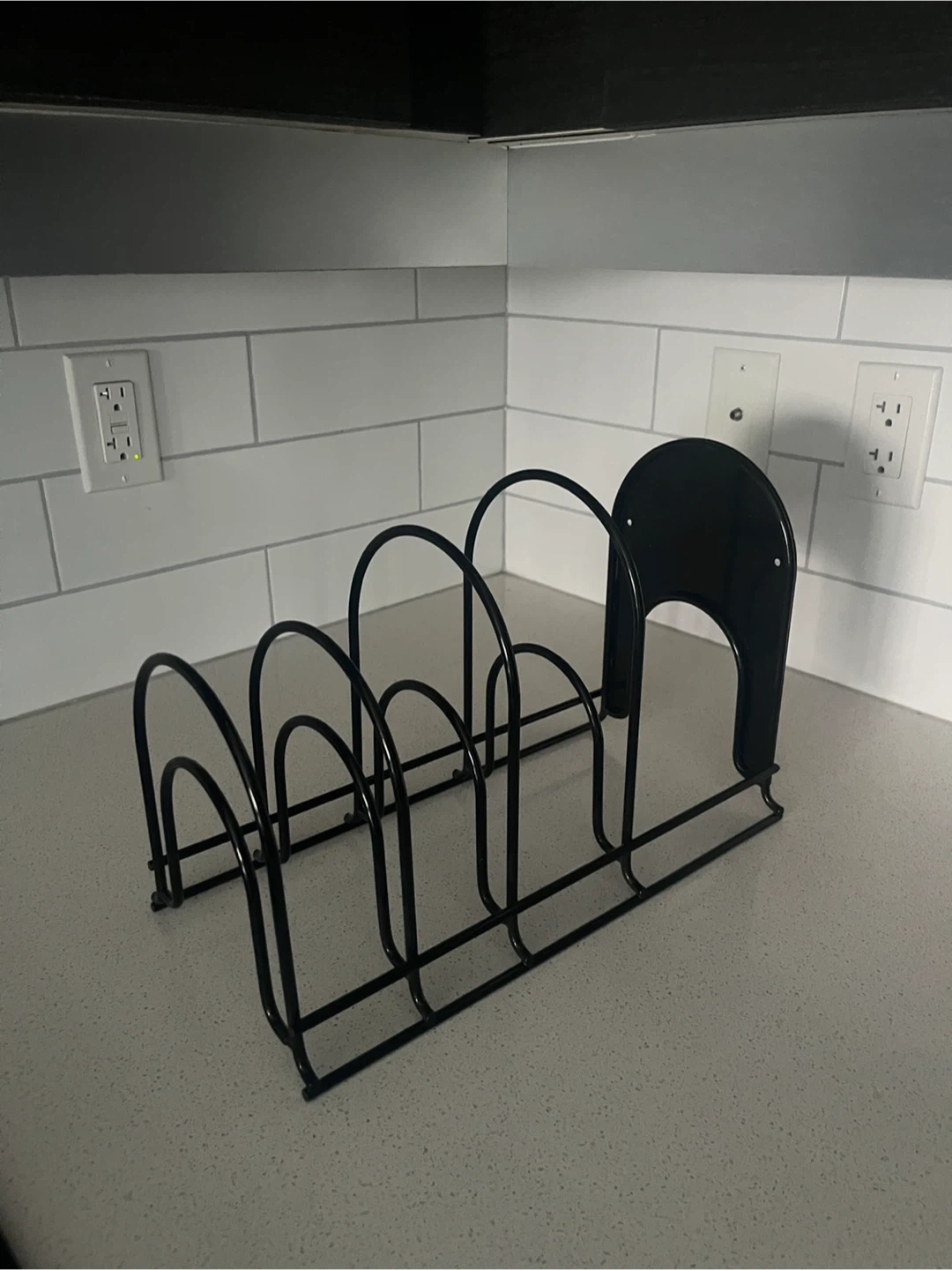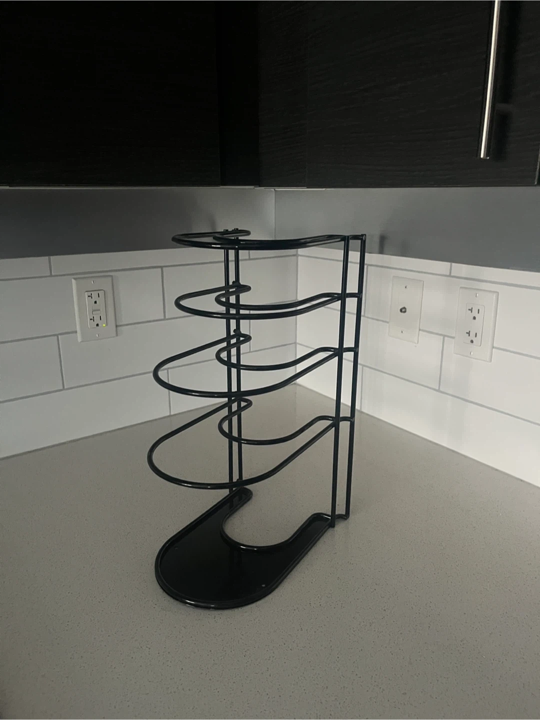 This black metal organizer rack holds multiple pots and pans upright. It's designed to keep your kitchen cabinets tidy and your cookware easily accessible. I used it to hold my Vinyls! Metal construction.