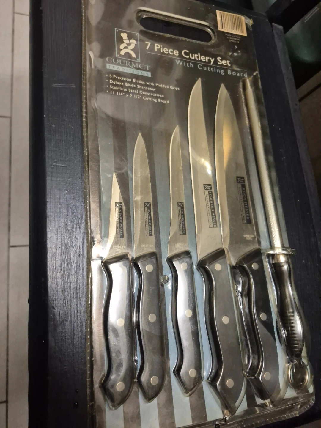 This set includes 5 precision blades with molded grips and a deluxe blade sharpener. All knives are stainless steel construction. It also comes with an 11 1/4" x 7 1/2" cutting board.