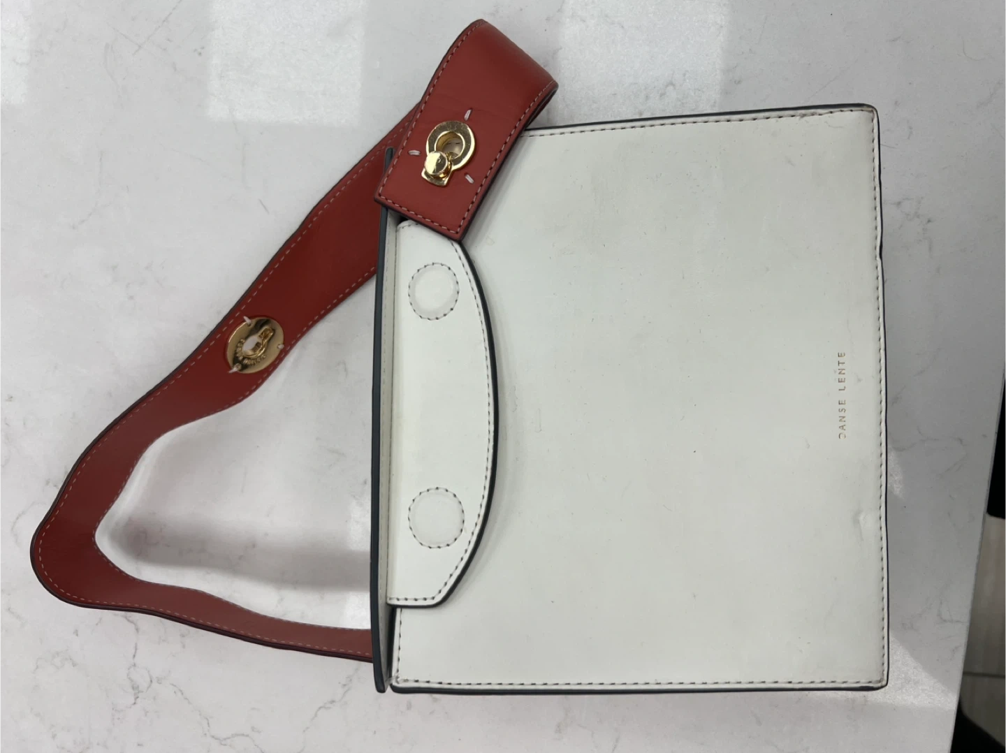 Selling an authentic Danse Lente leather bag featuring a minimalist, modern design. High-quality structured leather with a removable/adjustable strap, perfect for everyday use or dressing up a simple outfit.