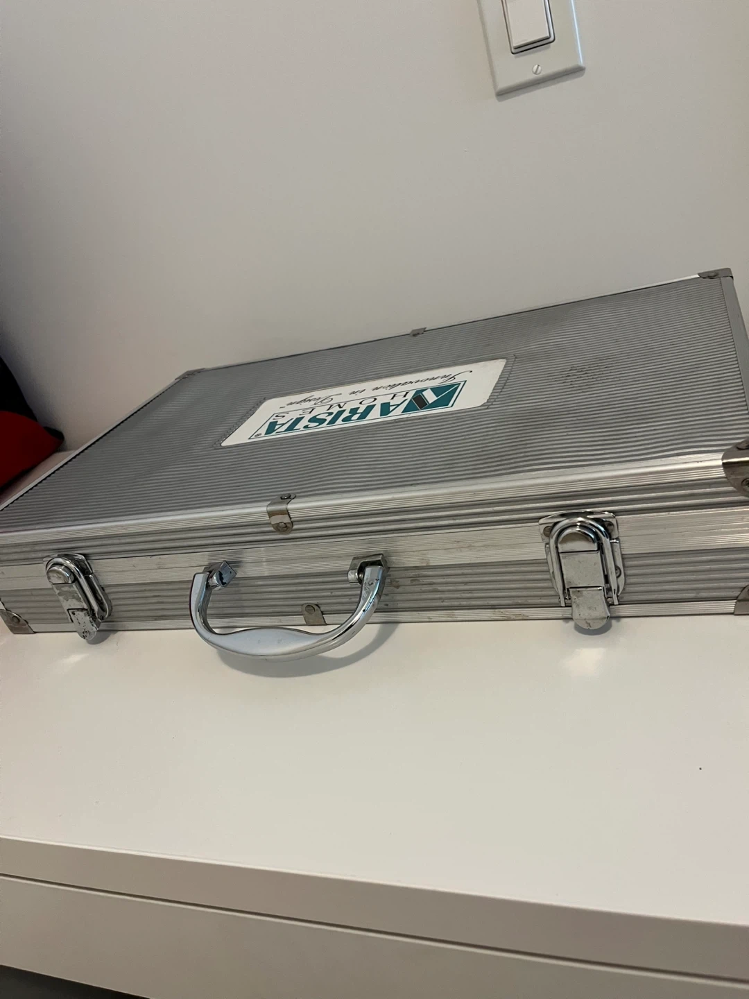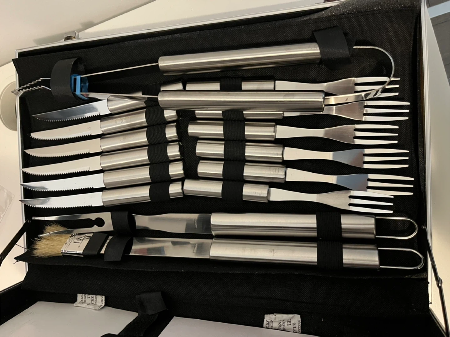 This barbecue tool set includes a variety of stainless steel utensils. This set is great for outdoor grilling and comes in a durable silver case. One item is missing the rest are all new.