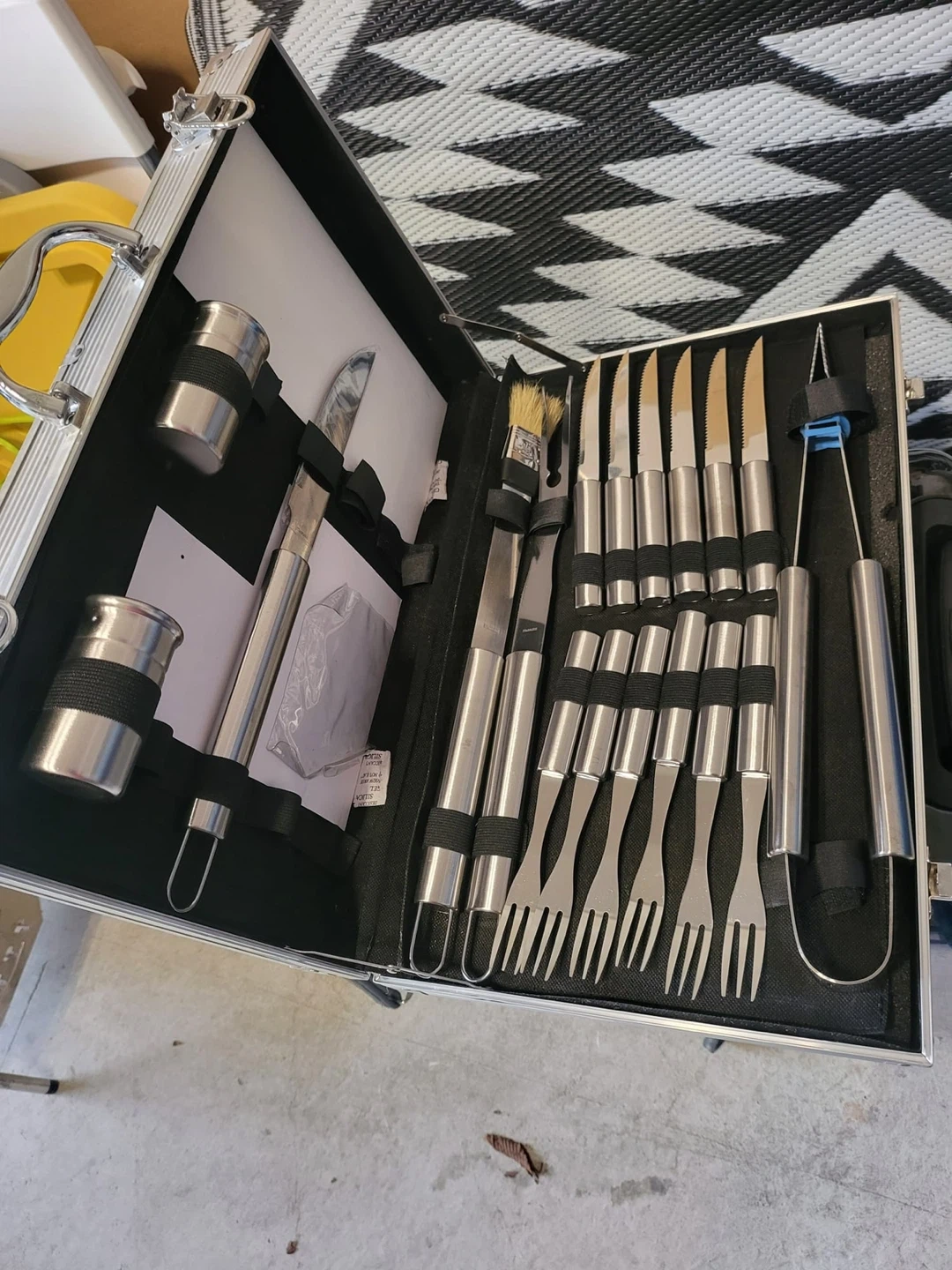 This barbecue tool set includes a variety of stainless steel utensils. This set is great for outdoor grilling and comes in a durable silver case. One item is missing the rest are all new.