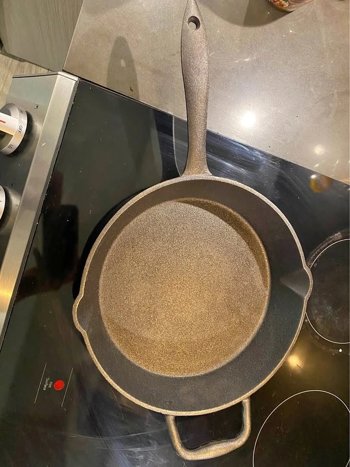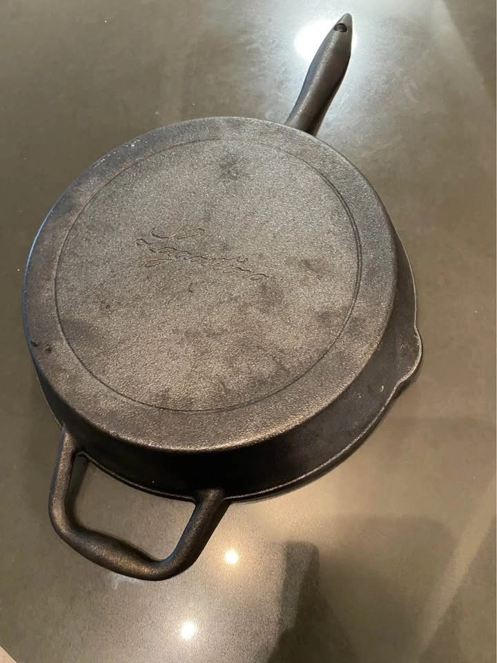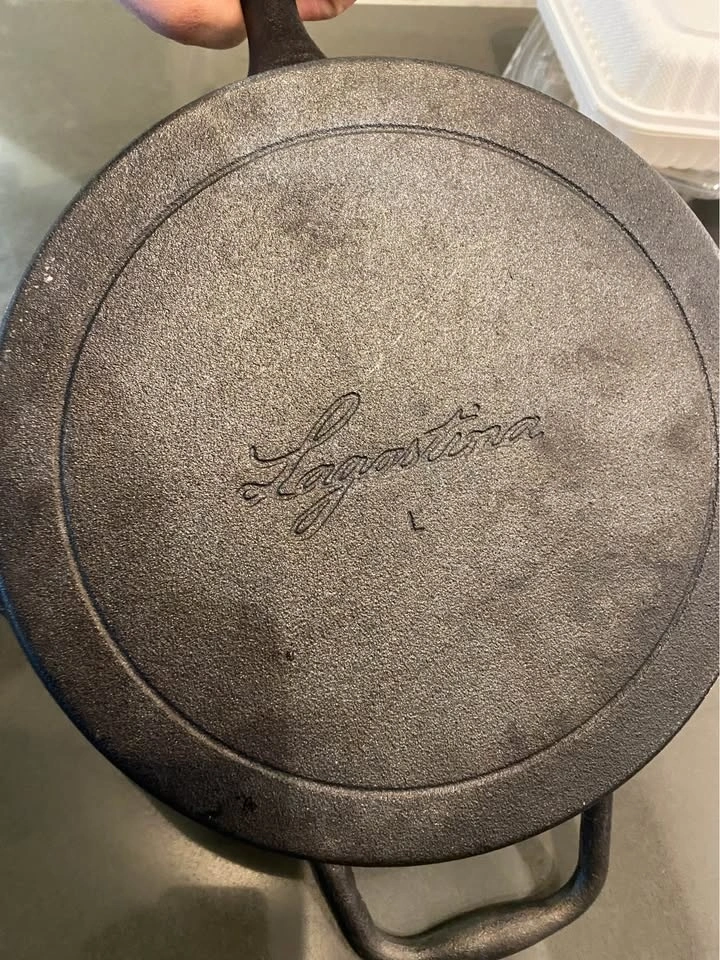Great cast iron skillet with 'Lagostina' branding. Has a handle for easy lifting and two side handles. Seasoning is intact. Used only a couple of times.