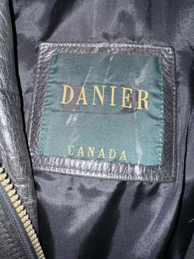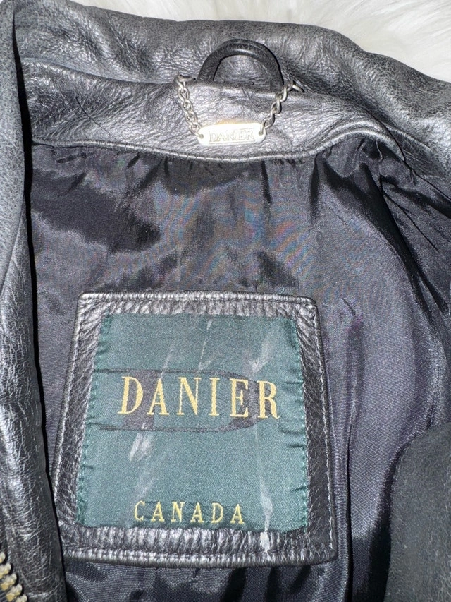 This is a stylish, previously worn Danier black leather jacket. It is in good condition and perfect for adding a touch of class to any outfit. Here are some additional details: