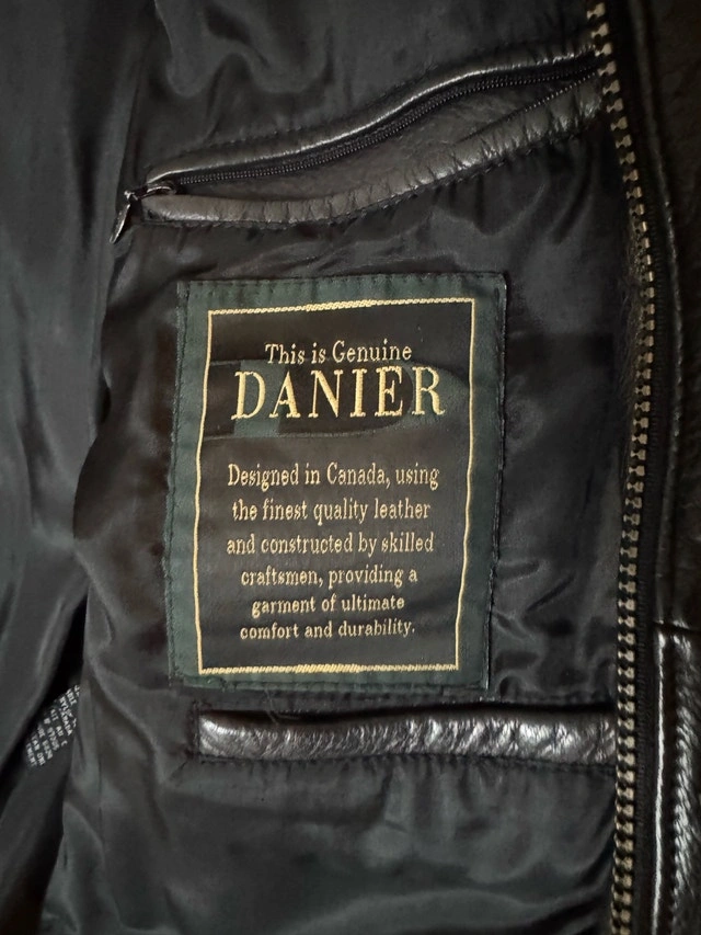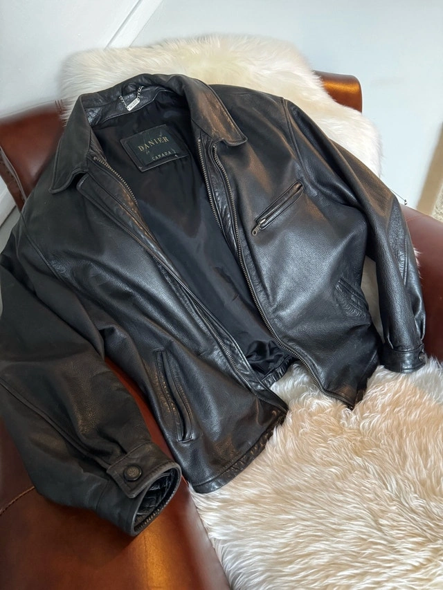 This is a stylish, previously worn Danier black leather jacket. It is in good condition and perfect for adding a touch of class to any outfit. Here are some additional details:
