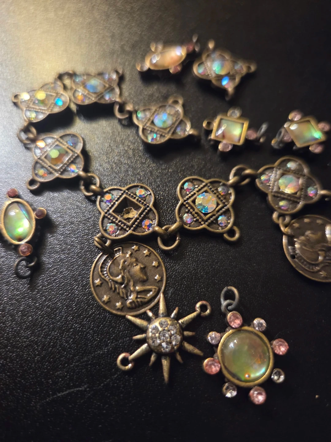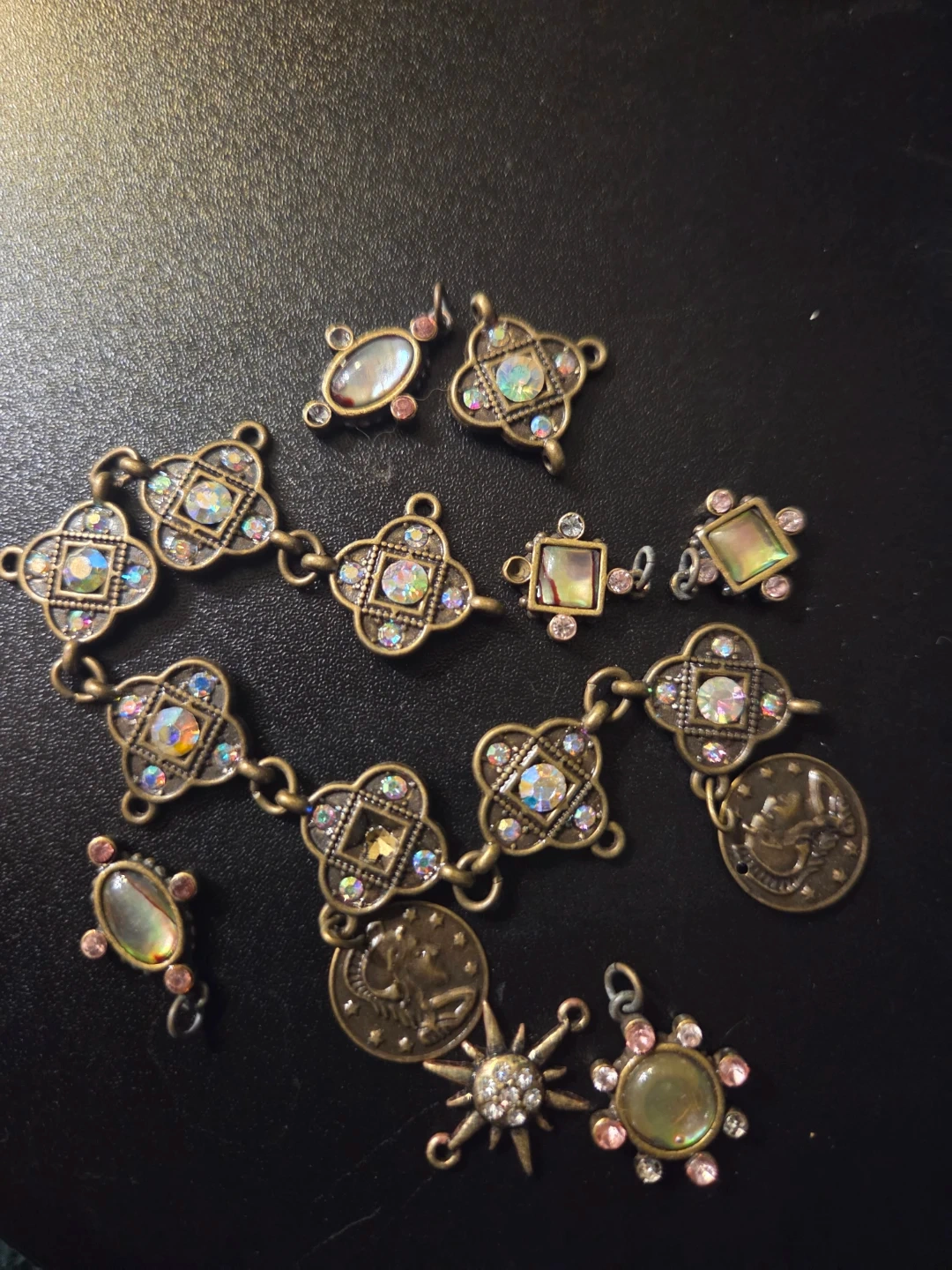 This lot includes various antique-style charm bracelet components. It features decorative links with faux gems and celestial-themed charms like moons and sunbursts. These pieces are great for crafting unique jewellery or customising existing pieces!