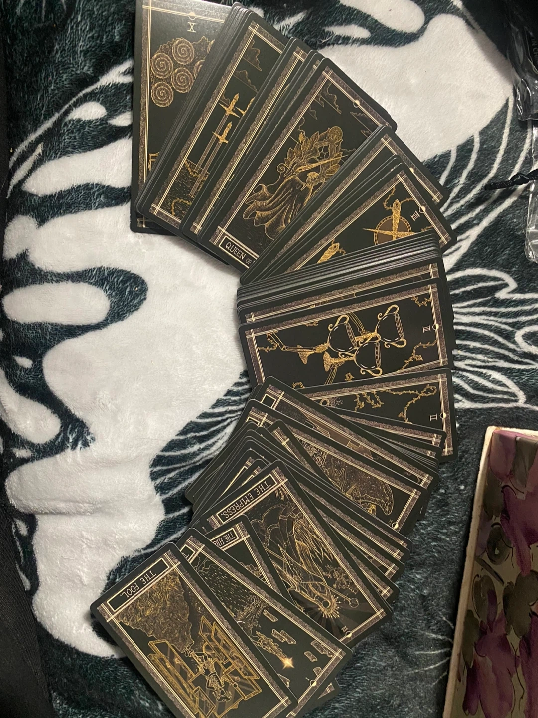 This is The Kinner Tarot Deck, featuring beautiful gold and black illustrations on each card. The deck includes all 78 standard tarot cards. Perfect for divination and self-reflection!